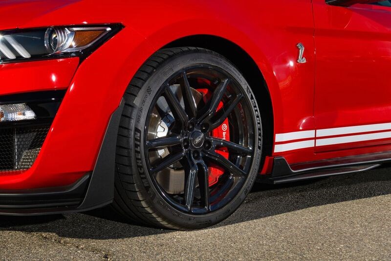 The 2020 Shelby GT500 is offers with two handling packages. The first includes a removable Gurney flap, adjustable strut top mounts, and splitter wickers. But the most badass GT500 is the one equipped with the Carbon Fiber Track Package. You get exposed 20-inch carbon-fiber wheels (with wider 11.5-inch rear rubber), custom Michelin track tires, and an adjustable carbon-fiber wing with an integrated dive plane for better grip. What you don't get in this package is the rear seat, which is removed in the name of cutting weight.