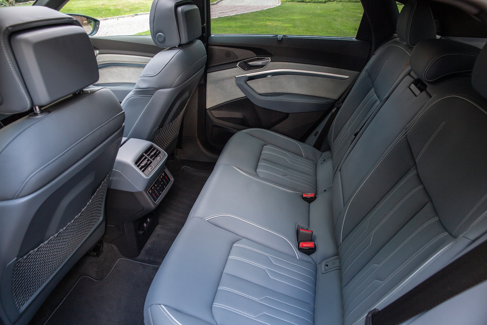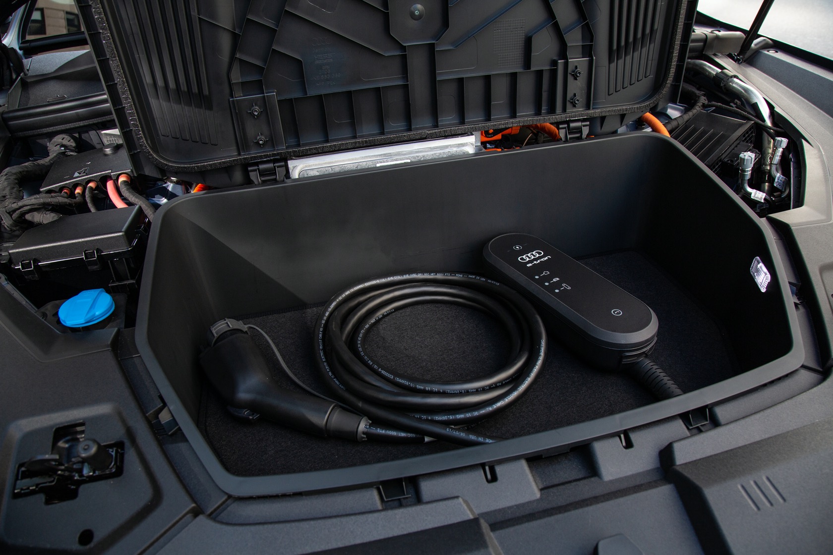 In the rear you get 27.2 cu-ft of space, surprisingly only 1.3 cu-ft less than the e-tron SUV offers. There's a front storage compartment under the hood, but it's small: Audi's charging cable takes up most of it. Even rear headroom isn't really all that impacted, with average height adults back there giving no complaints.