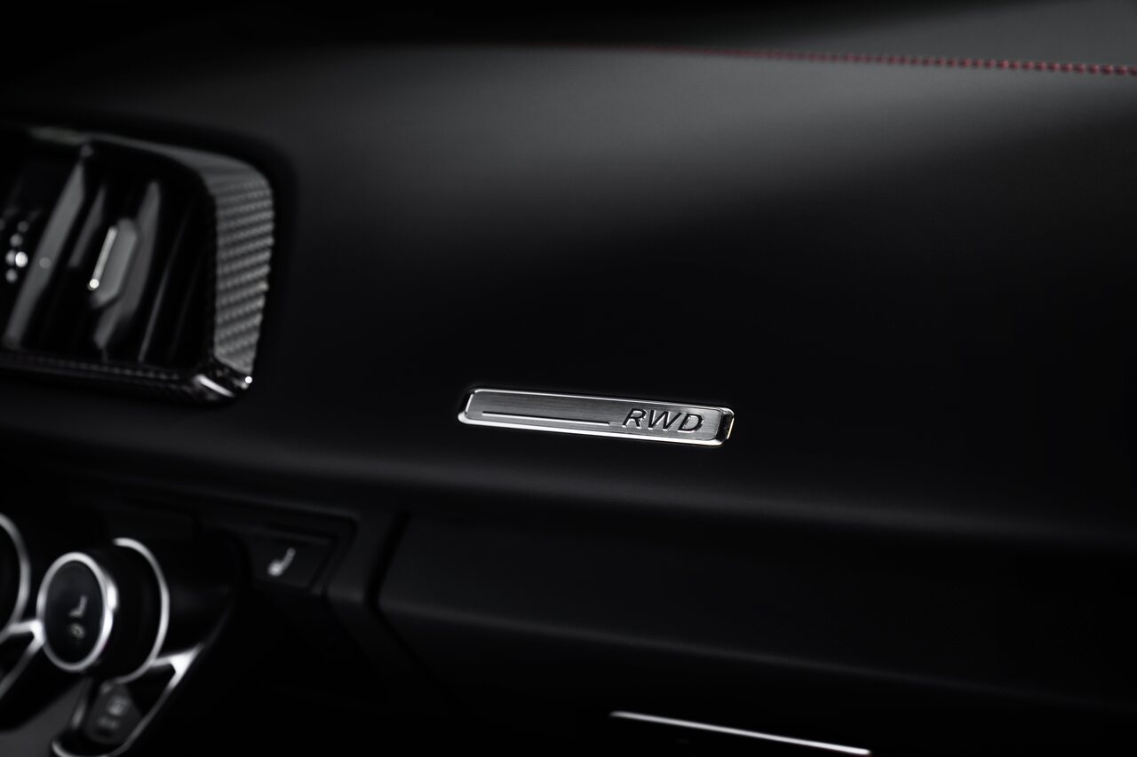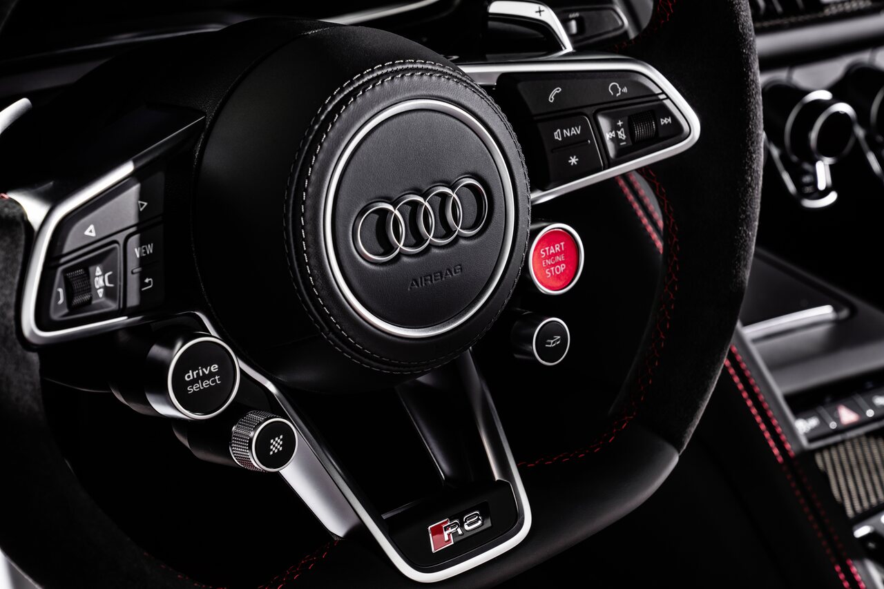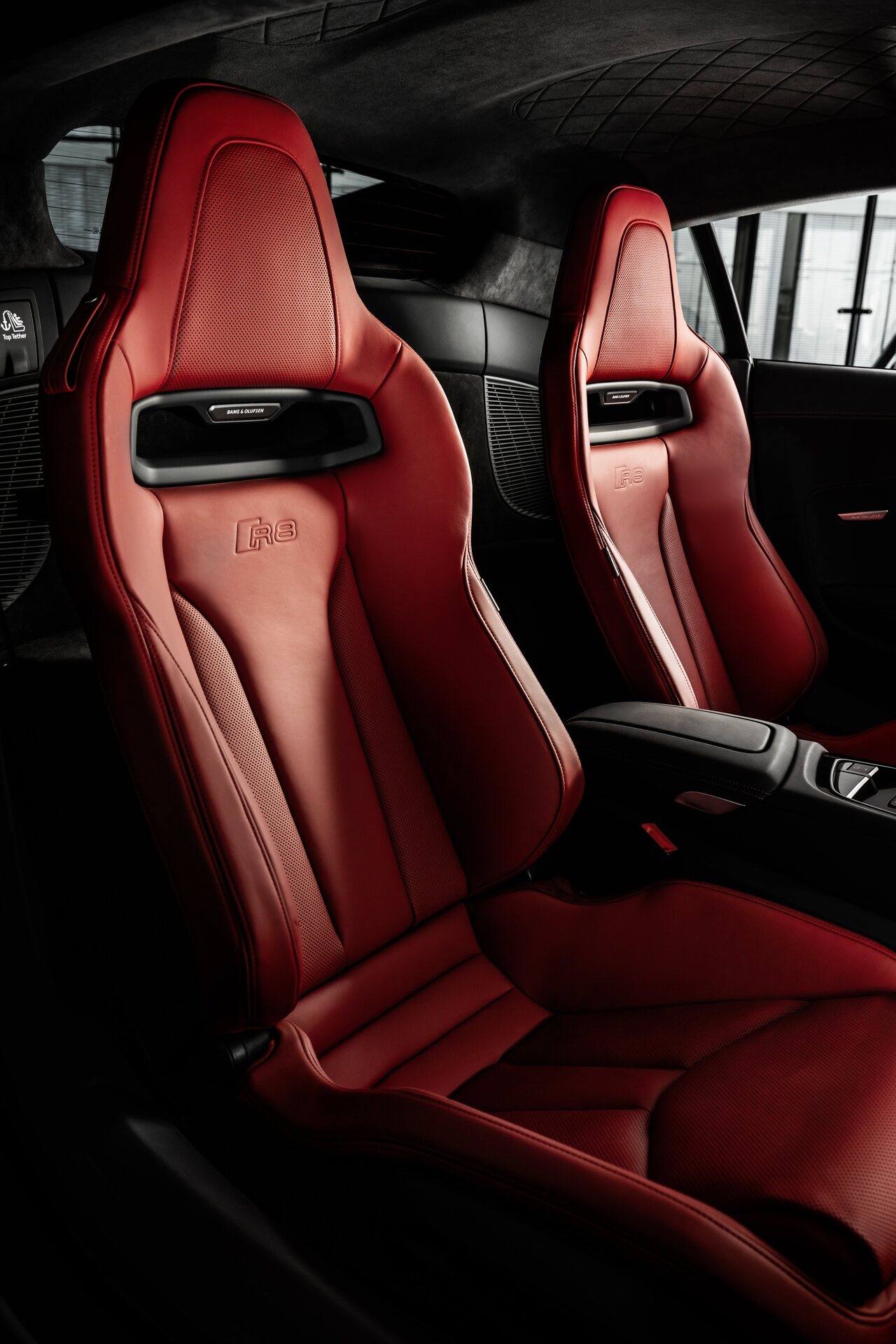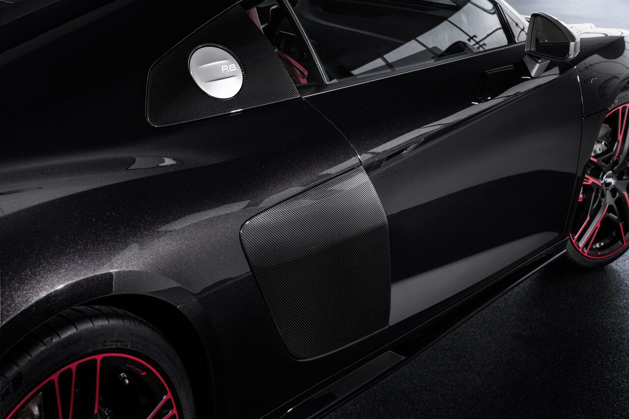 Complementing its new Panther Black paint are a bevy of carbon-fiber exterior trim, including the mirror caps, side intakes, and the rear engine cover. Blacked-out Audi badges are standard, too, while 20-inch double-spoke matte black wheels complete the sinister vibe.