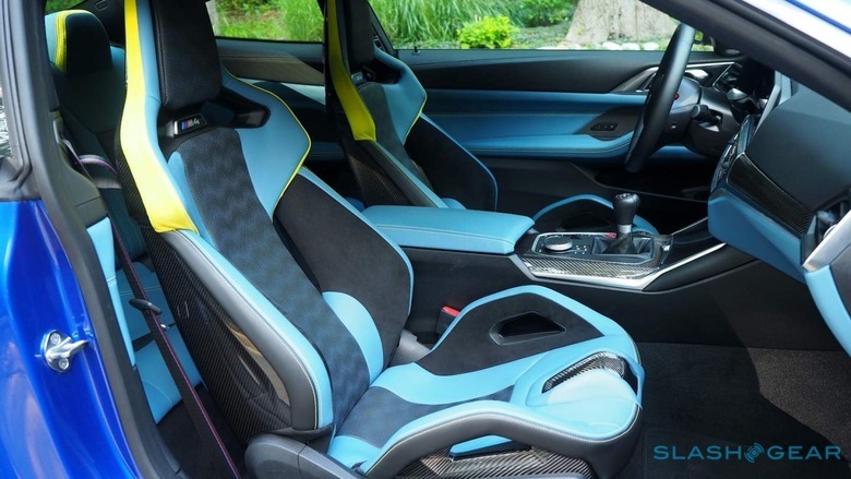 Inside, the cabin is familiar but outfitted with a host of performance trim. The $950 Carbon Fiber package lavishes it on the center console, dashboard, doors, and elsewhere, to match the striking roof. Spend $3,800 on the M Carbon Bucket Seats, meanwhile, and you get a set of impressive sports thrones. Their light blue and eye-searing yellow leather is an acquired taste, as is the hump at the front between your thighs. BMW tells me it lends support in more urgent track conditions, but it still feels weird to me.