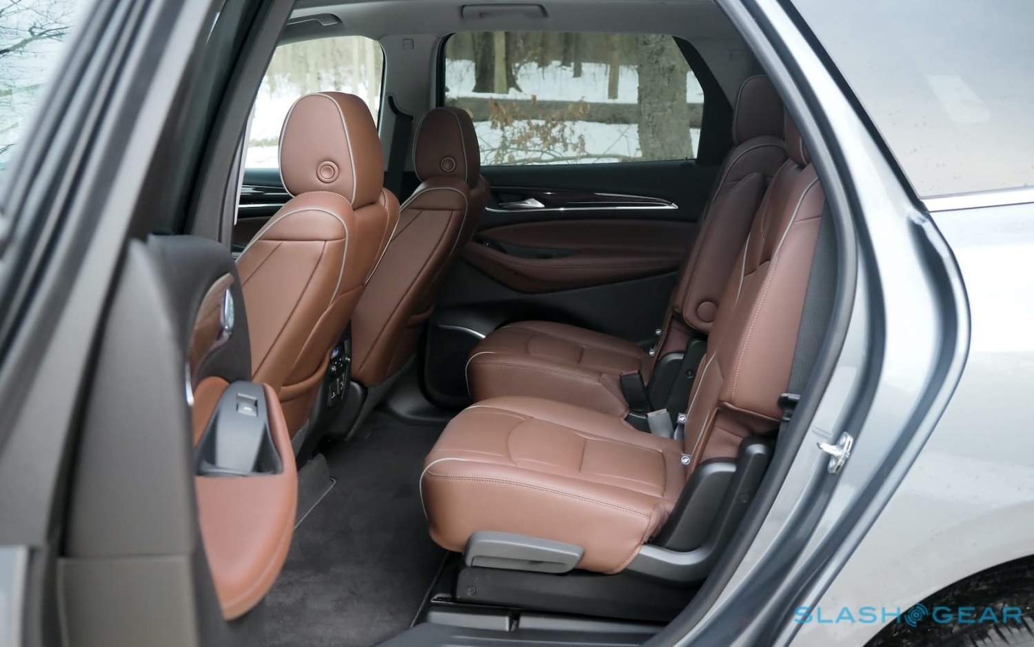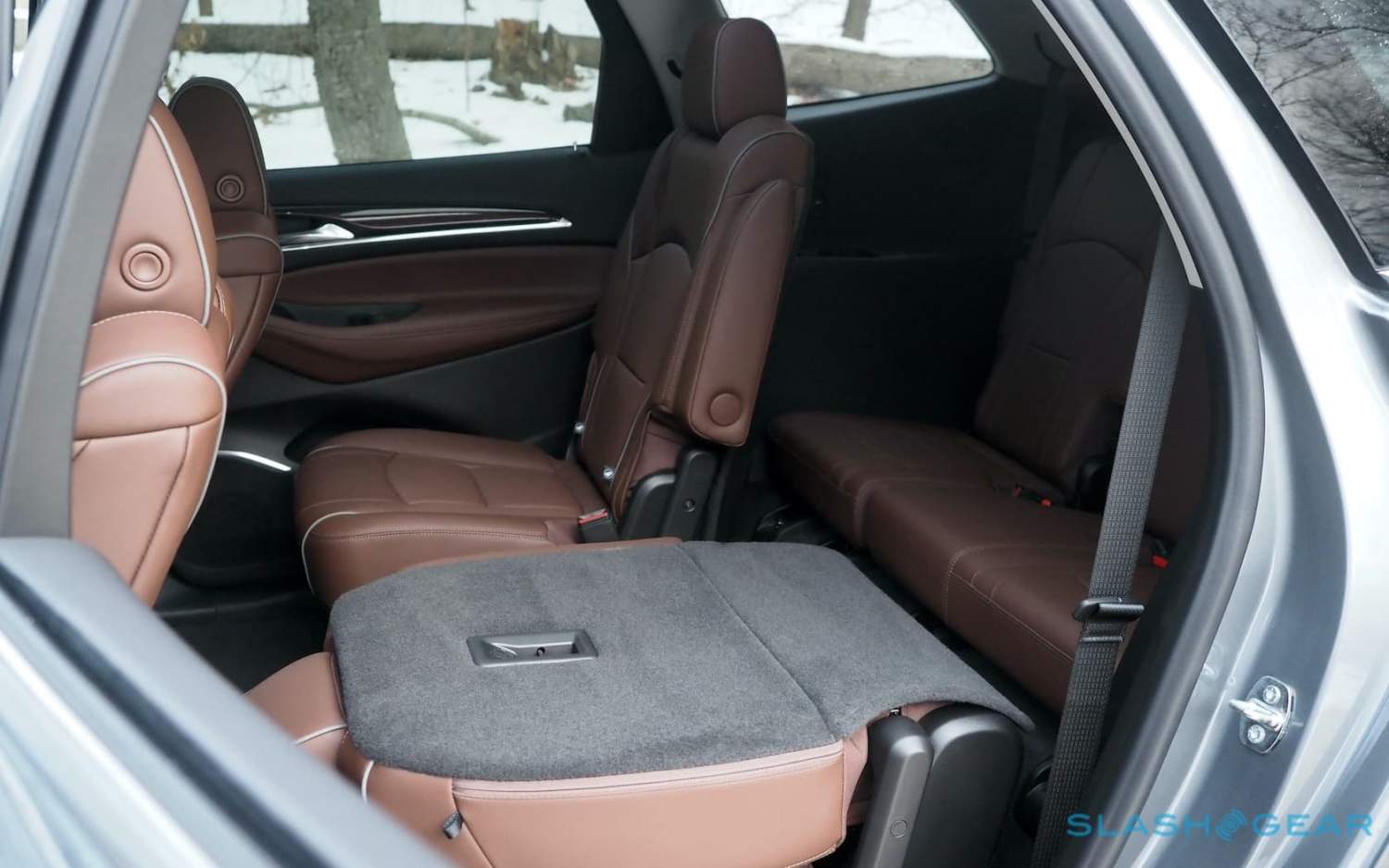 Inside there's leather on the seven seats, with the front two getting heating and ventilation along with power-adjustment and massage. The second row is heated, while the third row bench can split 60/40 and power-fold down for more cargo space. There's 23.6 cu-ft with all three rows up, 58 cu-ft with the third row flat, or 96.6 cu-ft behind the first row. That's impressive, even for the class, and Buick includes plenty of cubbies and storage nooks around the cabin too.