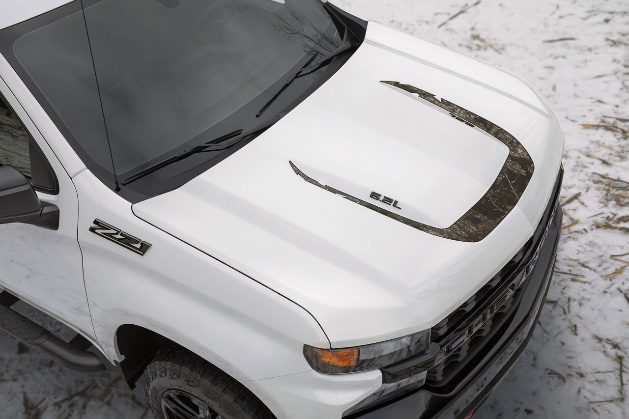 The standard engine for the truck is a 5.3-liter V8 with a 6-speed automatic. An optional engine is a 6.2-liter V8 that makes 420 hp and 460 lb-ft of torque with a 10-speed automatic. Realtree camo graphics are on the outside of the truck, at the end of the bed, and on the interior door trim. The Realtree logo is also integrated into the standard bedliner.