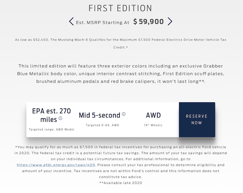 Finally, there'll be a limited edition Mustang Mach-E First Edition, priced from $59,900 before incentives. It'll have AWD and 19-inch wheels as standard, an estimated 270 mile range, and mid-5 second 0-60 time. It'll come in a choice of three exterior colors, including an exclusive Grabber Blue Metallic, with red brake calipers, while inside there'll be special contrast stitching, First Edition scuff plates, and brushed aluminum pedals.