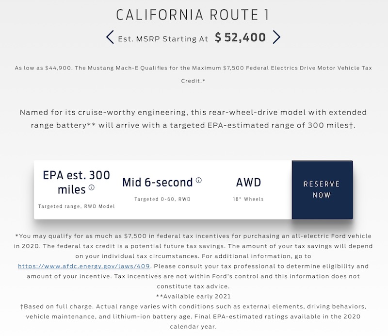 Then there's the Mustang Mach-E California Route 1. That'll be from $52,400 before incentives, and offered in RWD only with 18-inch wheels. It'll do an estimated 300 miles and have a mid-6 second 0-60 mph time. Ford describes it as "cruise-worthy" and it comes with the automaker's extended range battery.