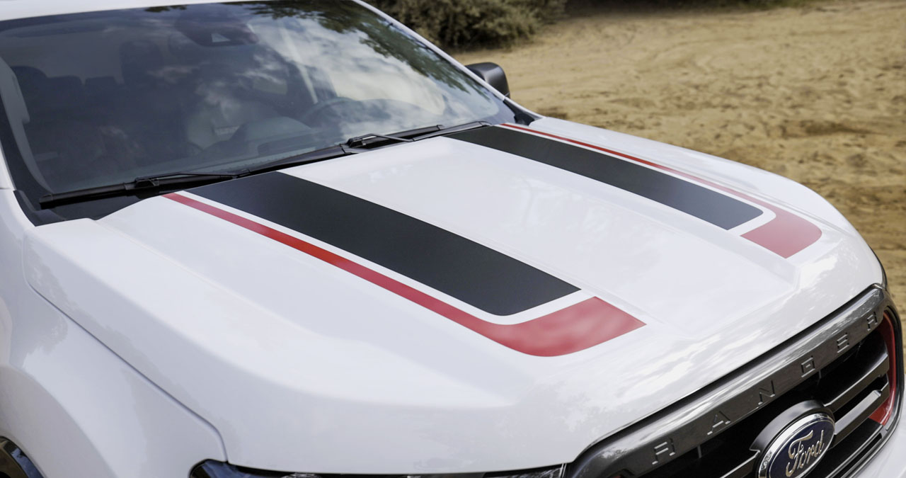 The truck's sides wear hoop-style steps, and the body features rear recovery hooks, a painted grille, and optional hood and body graphics. The interior of the pickup has package-exclusive seats with Miko suede inserts and black interior accents. The special lifted suspension also features redesigned front knuckles and has 9.7-inches of ground clearance, which is 0.8 inches more than a regular Ranger SuperCrew 4x4.
