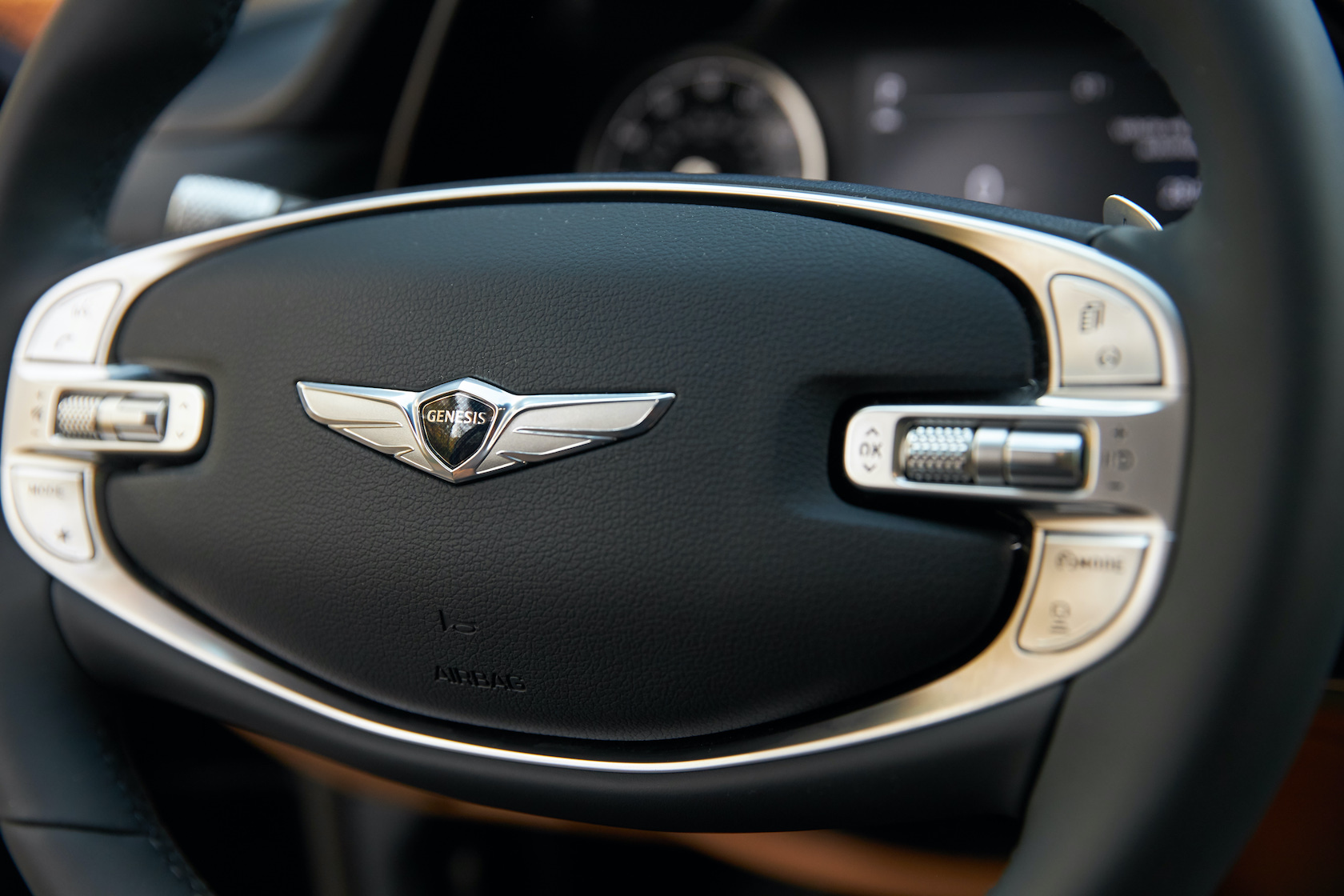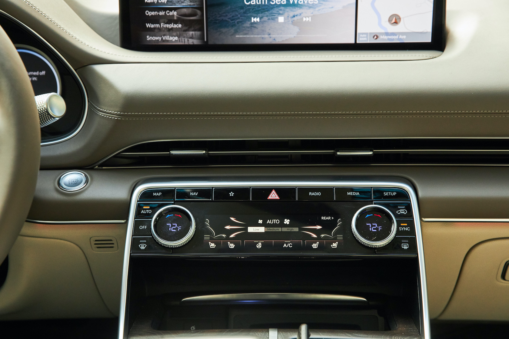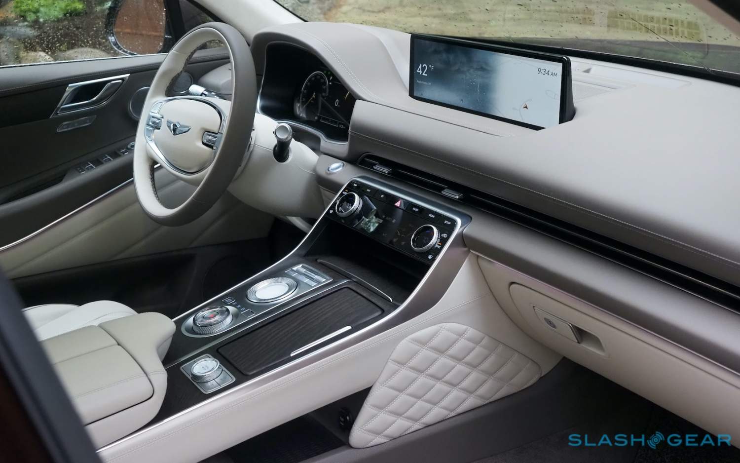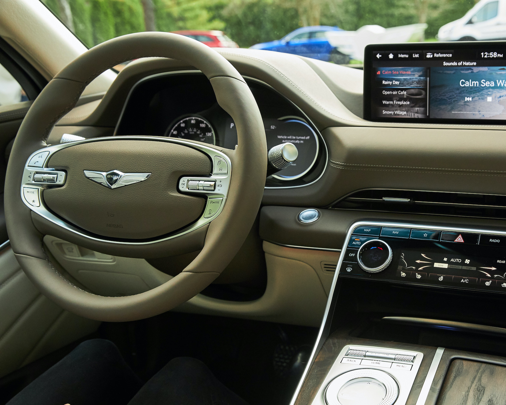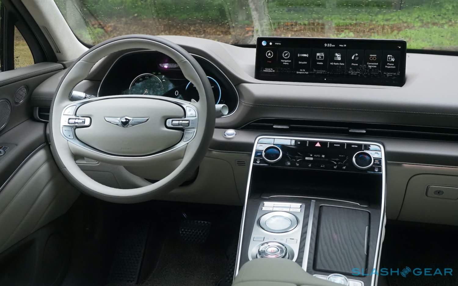 Inside, it's a calmer, cleaner place than some SUV cabins we've seen. Genesis keeps the switchgear to a functional minimum, preferring to put most of the detail on the GV80's trio of screens. That includes digital graphics for the driver, a small screen for HVAC controls, and then a huge 14.5-inch widescreen panel atop the dashboard. That's remotely controlled using a handwriting-recognizing dial in the center console.