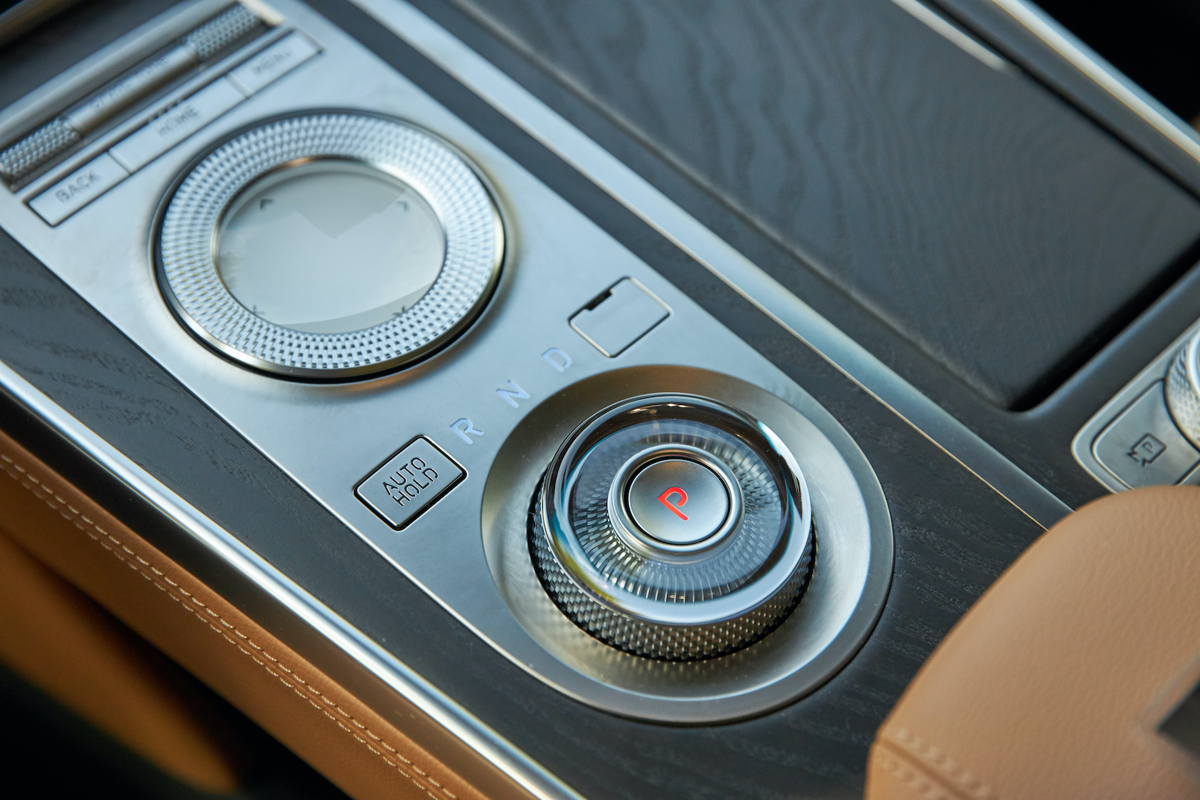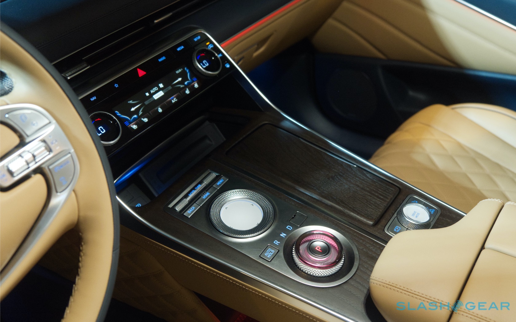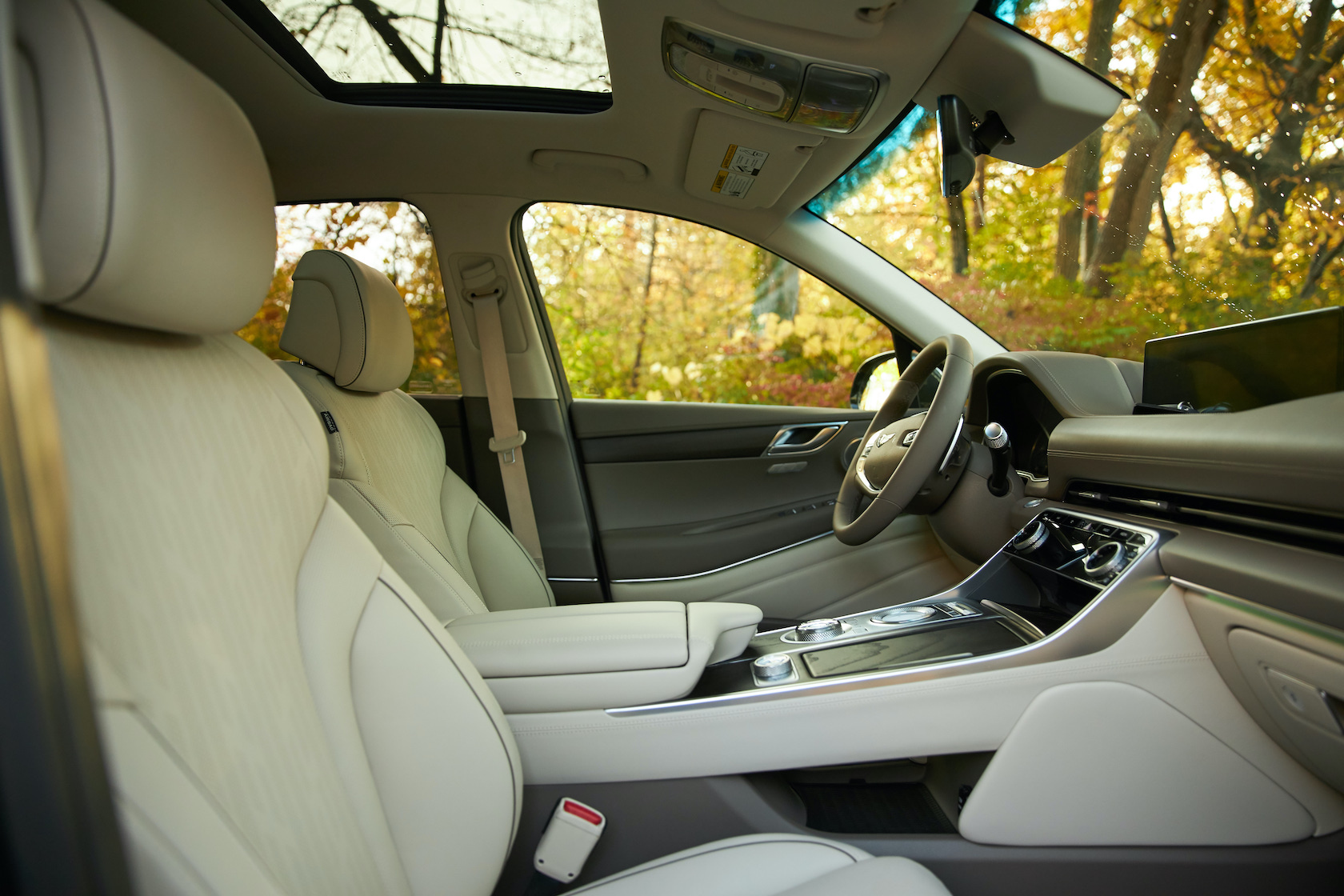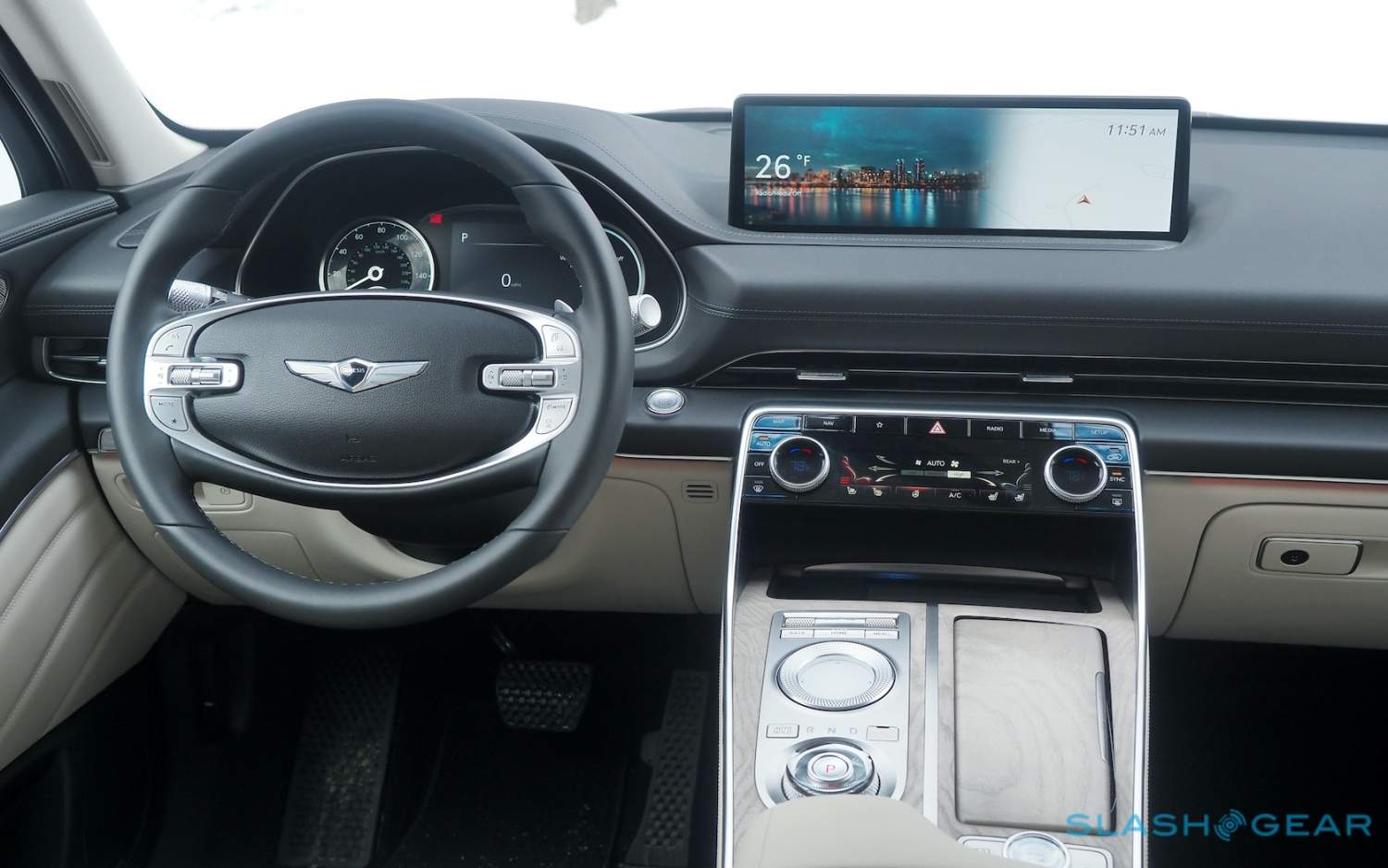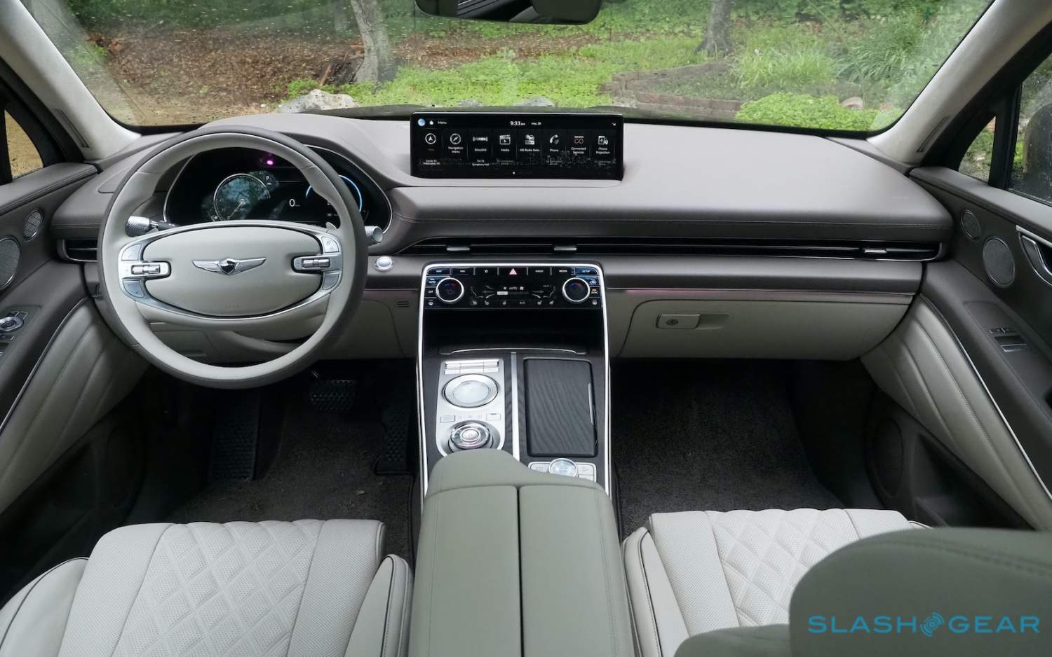 Inside, it's a calmer, cleaner place than some SUV cabins we've seen. Genesis keeps the switchgear to a functional minimum, preferring to put most of the detail on the GV80's trio of screens. That includes digital graphics for the driver, a small screen for HVAC controls, and then a huge 14.5-inch widescreen panel atop the dashboard. That's remotely controlled using a handwriting-recognizing dial in the center console.