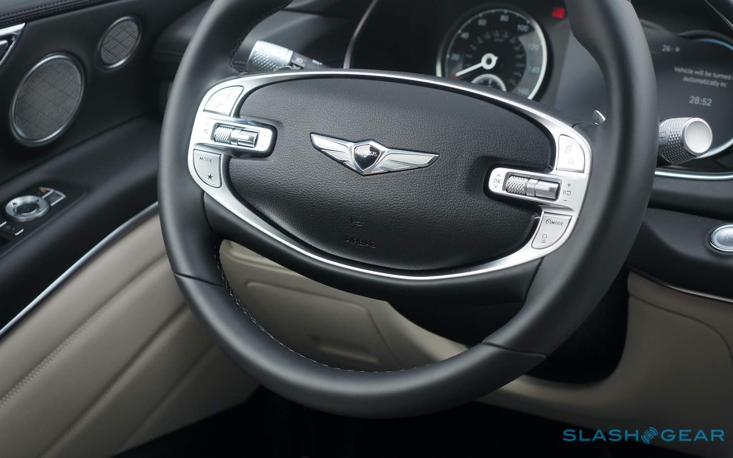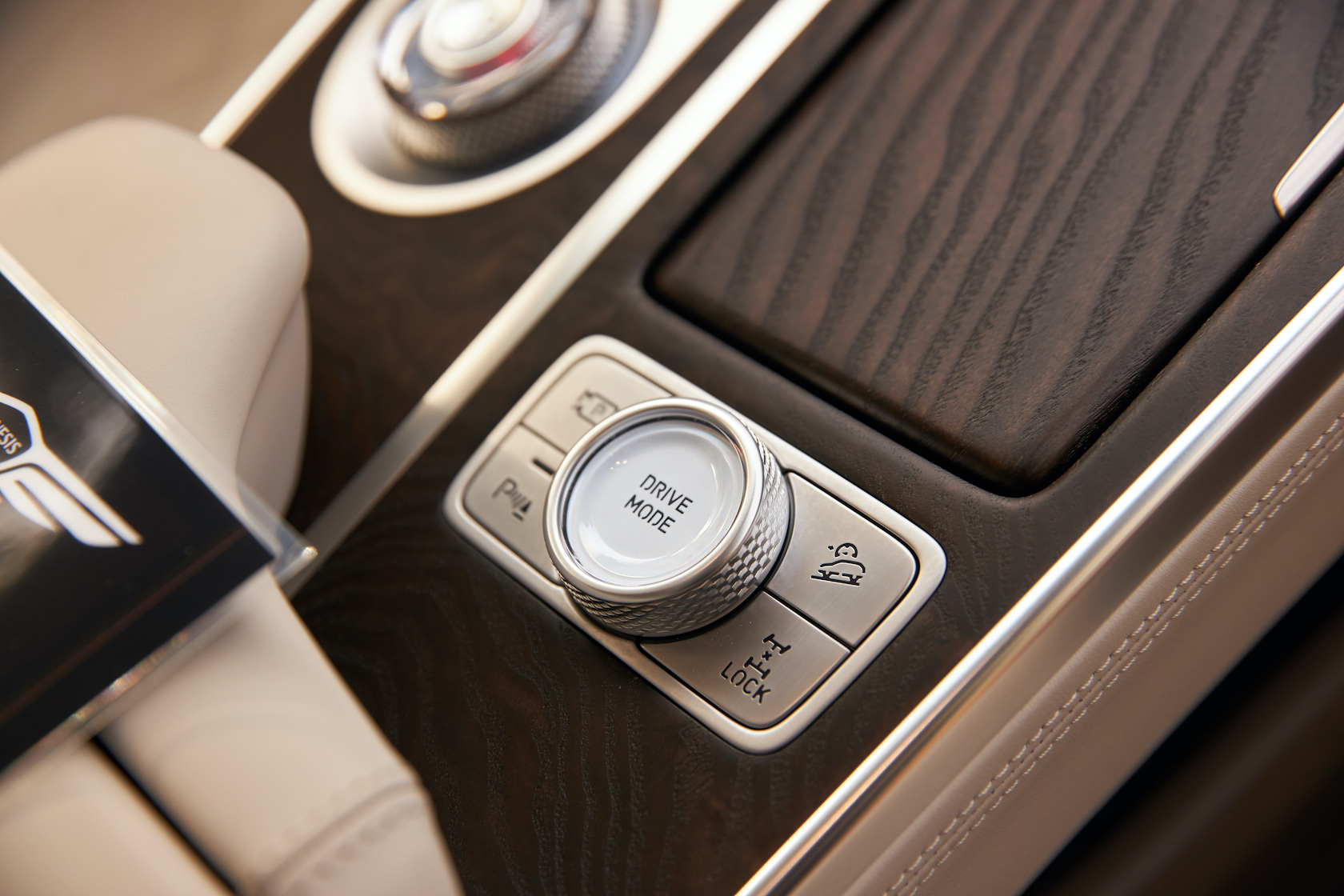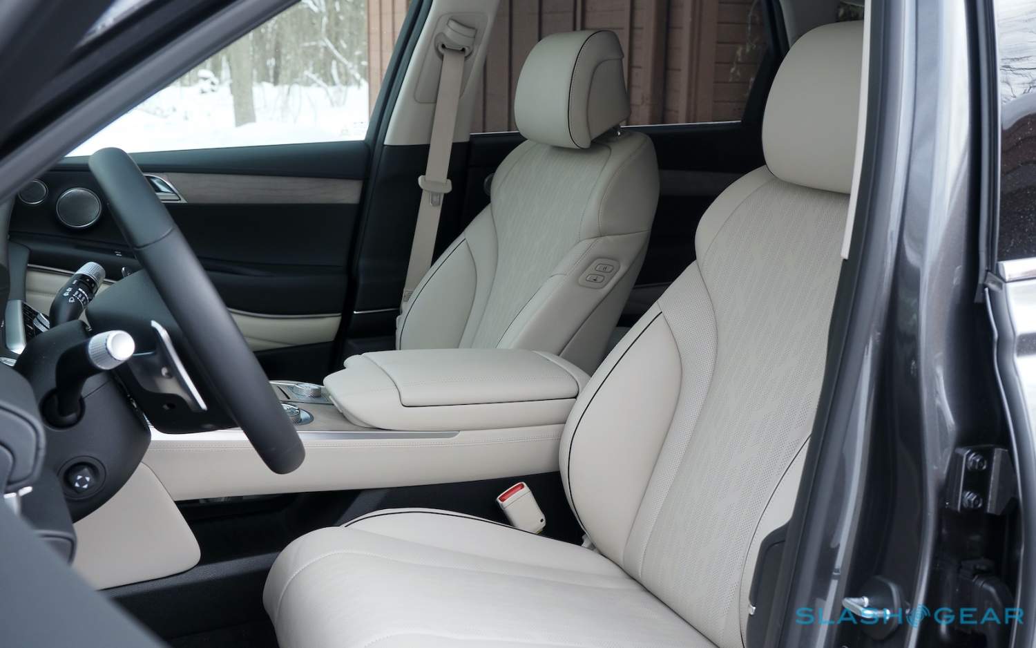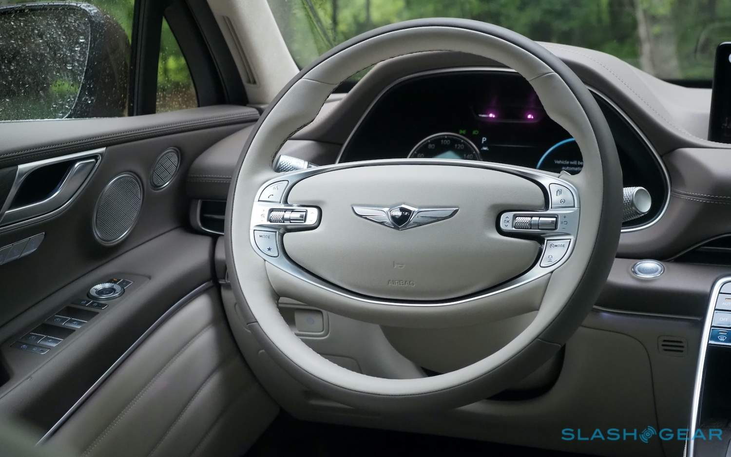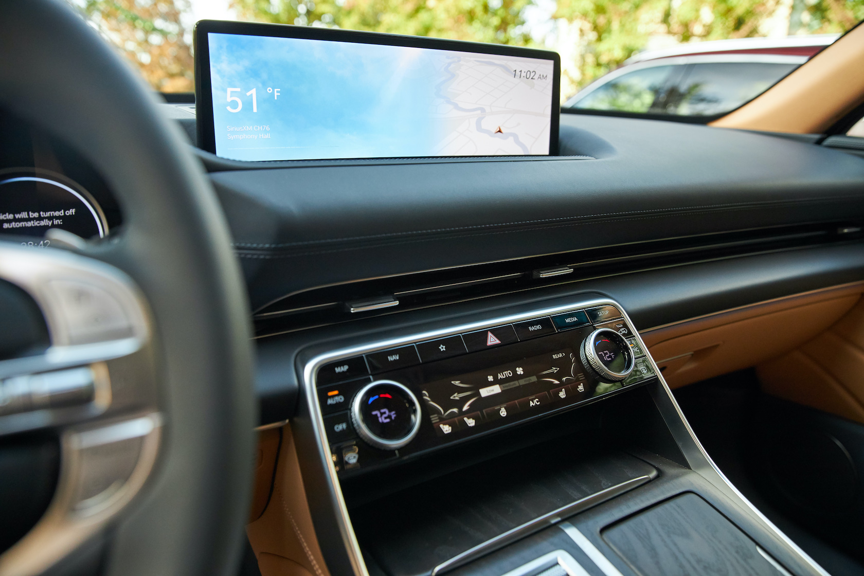 Inside, it's a calmer, cleaner place than some SUV cabins we've seen. Genesis keeps the switchgear to a functional minimum, preferring to put most of the detail on the GV80's trio of screens. That includes digital graphics for the driver, a small screen for HVAC controls, and then a huge 14.5-inch widescreen panel atop the dashboard. That's remotely controlled using a handwriting-recognizing dial in the center console.