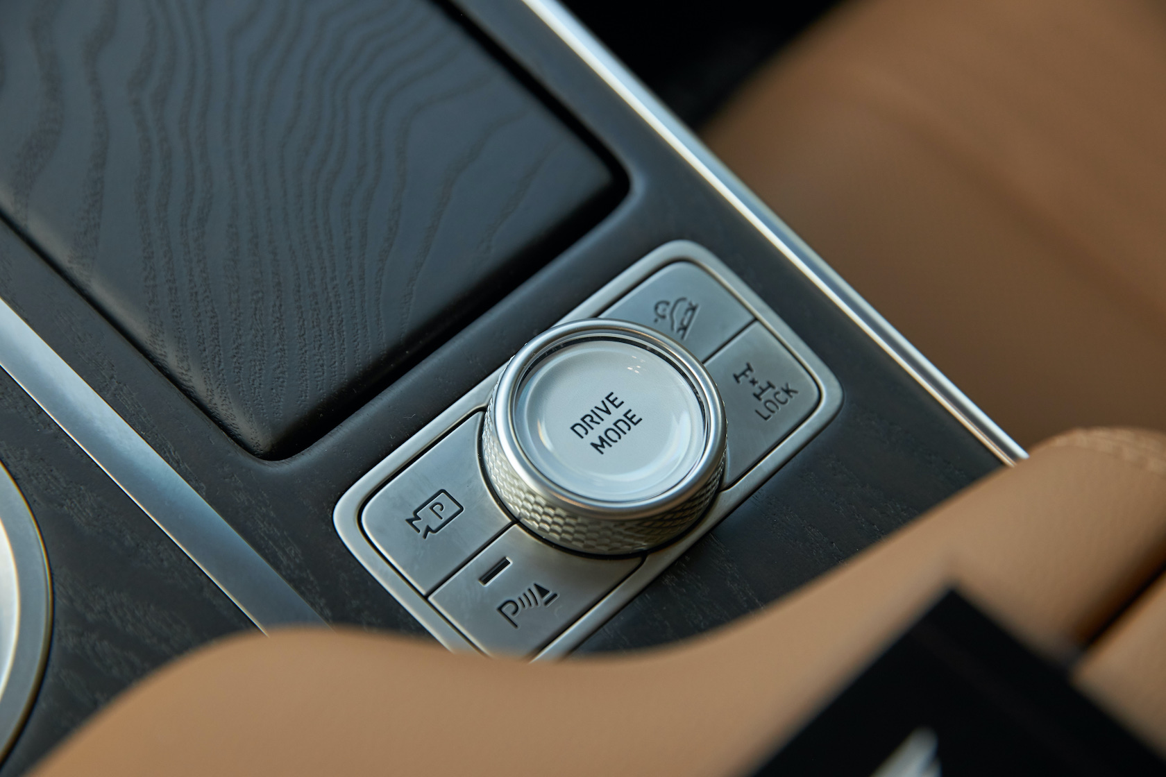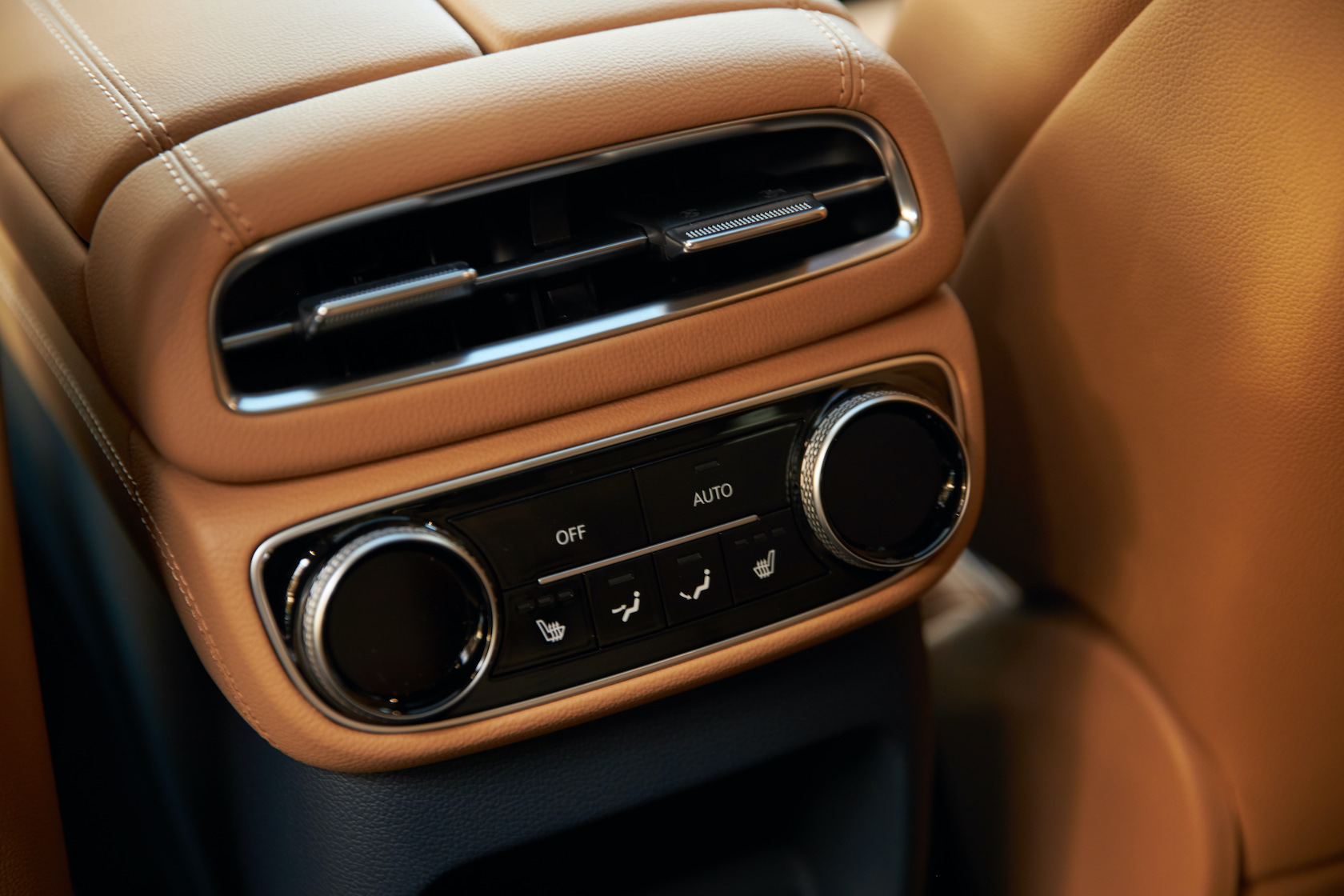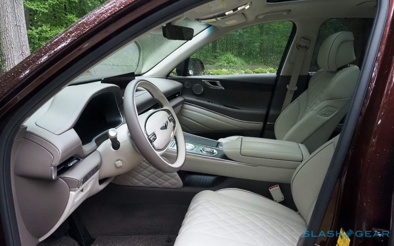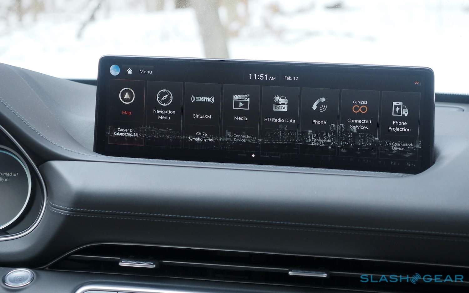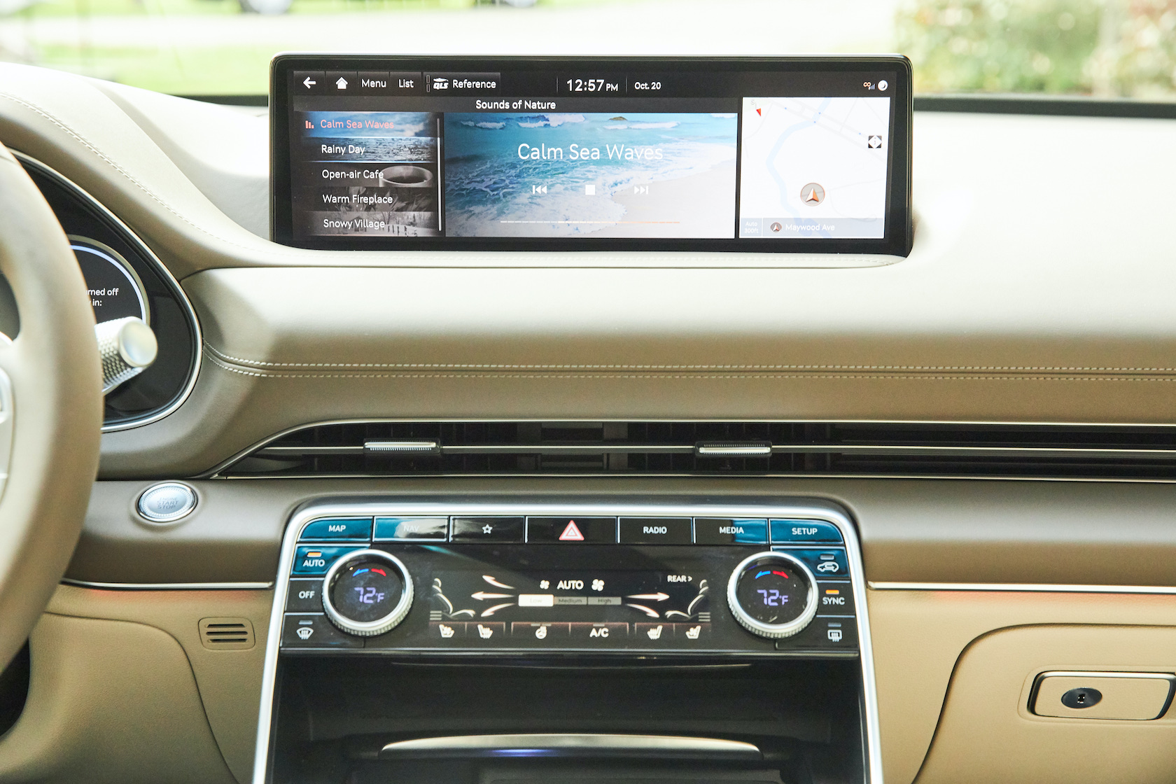 Inside, it's a calmer, cleaner place than some SUV cabins we've seen. Genesis keeps the switchgear to a functional minimum, preferring to put most of the detail on the GV80's trio of screens. That includes digital graphics for the driver, a small screen for HVAC controls, and then a huge 14.5-inch widescreen panel atop the dashboard. That's remotely controlled using a handwriting-recognizing dial in the center console.