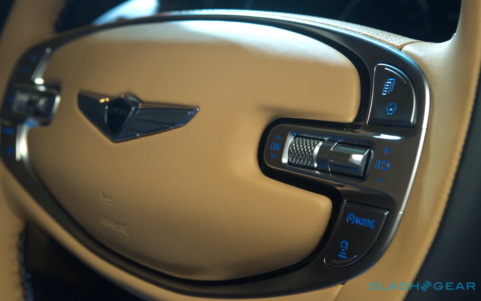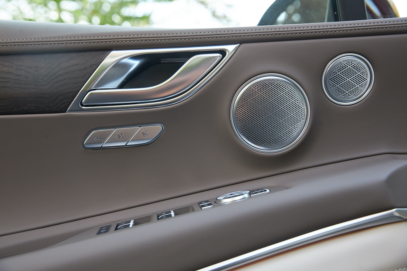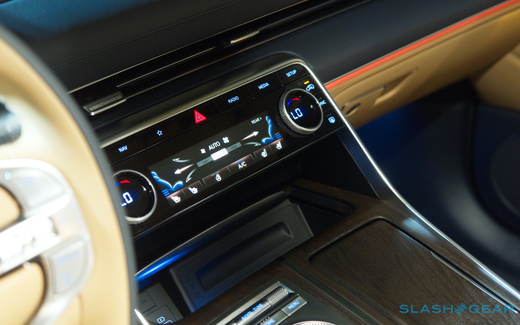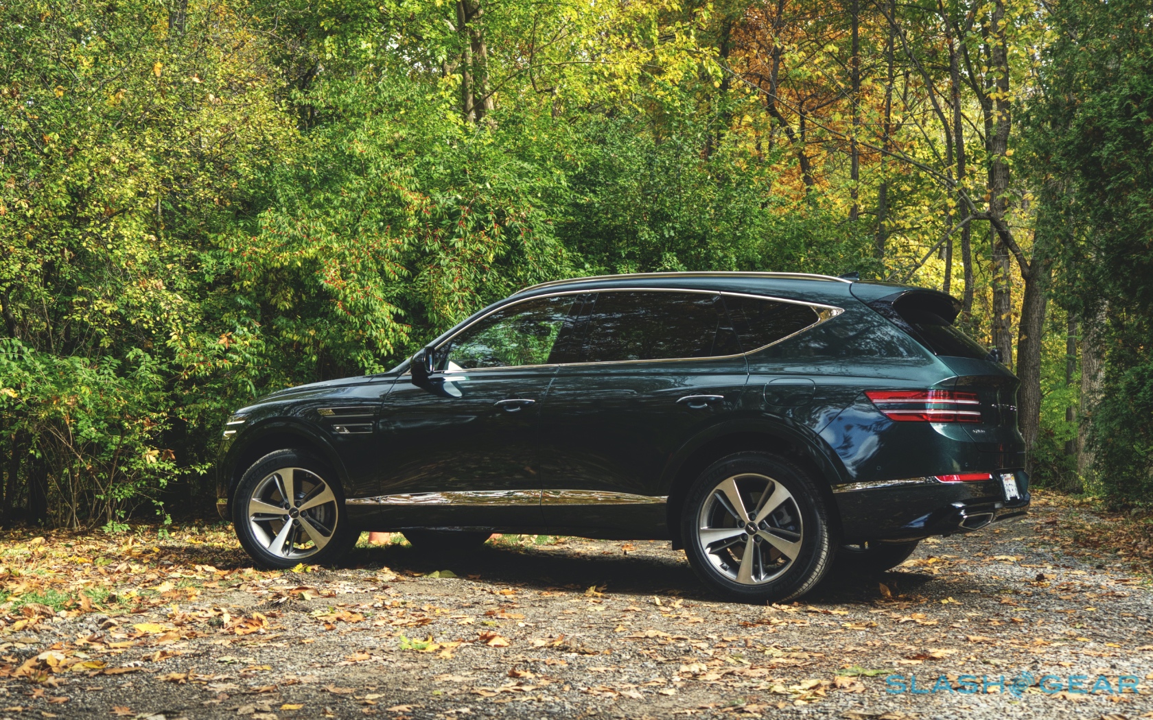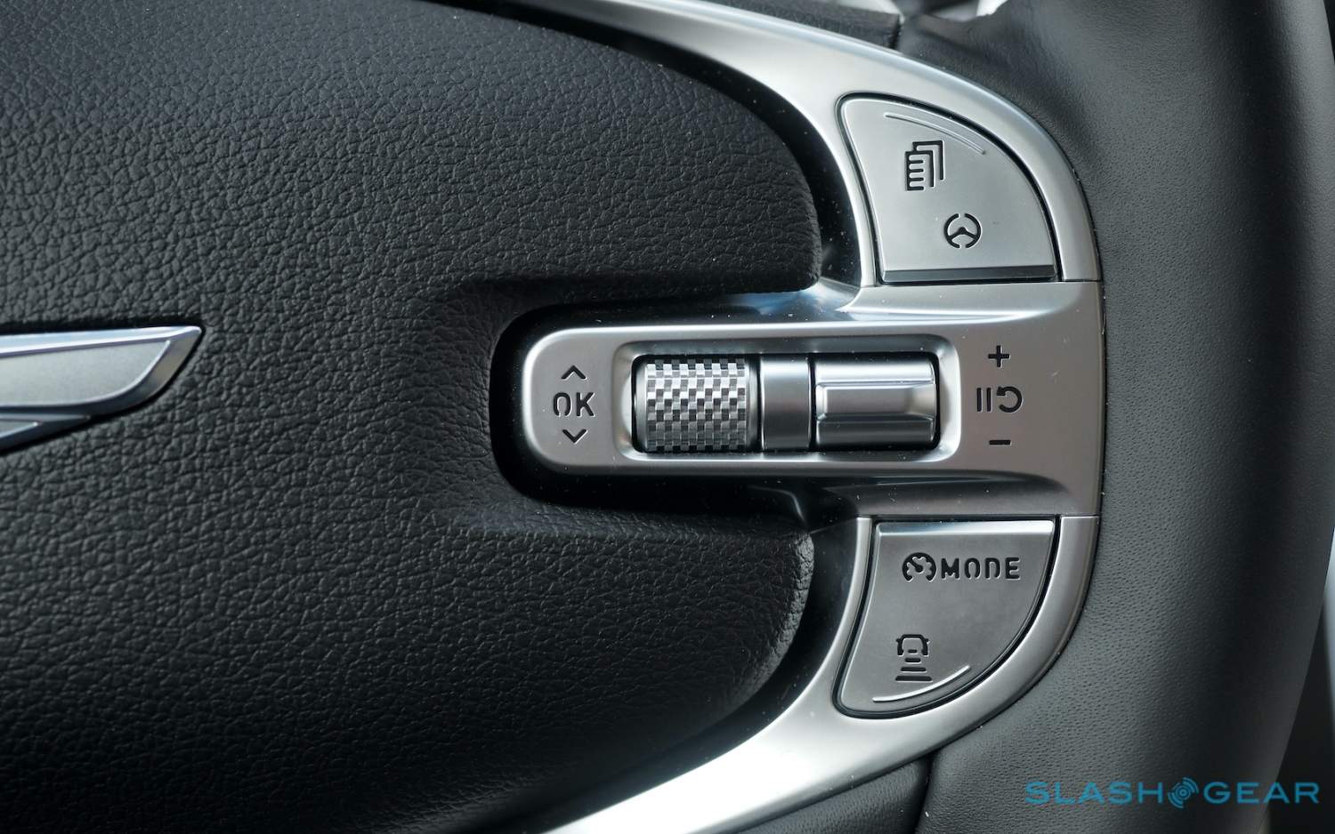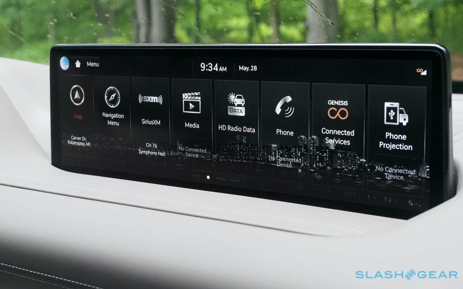 Inside, it's a calmer, cleaner place than some SUV cabins we've seen. Genesis keeps the switchgear to a functional minimum, preferring to put most of the detail on the GV80's trio of screens. That includes digital graphics for the driver, a small screen for HVAC controls, and then a huge 14.5-inch widescreen panel atop the dashboard. That's remotely controlled using a handwriting-recognizing dial in the center console.