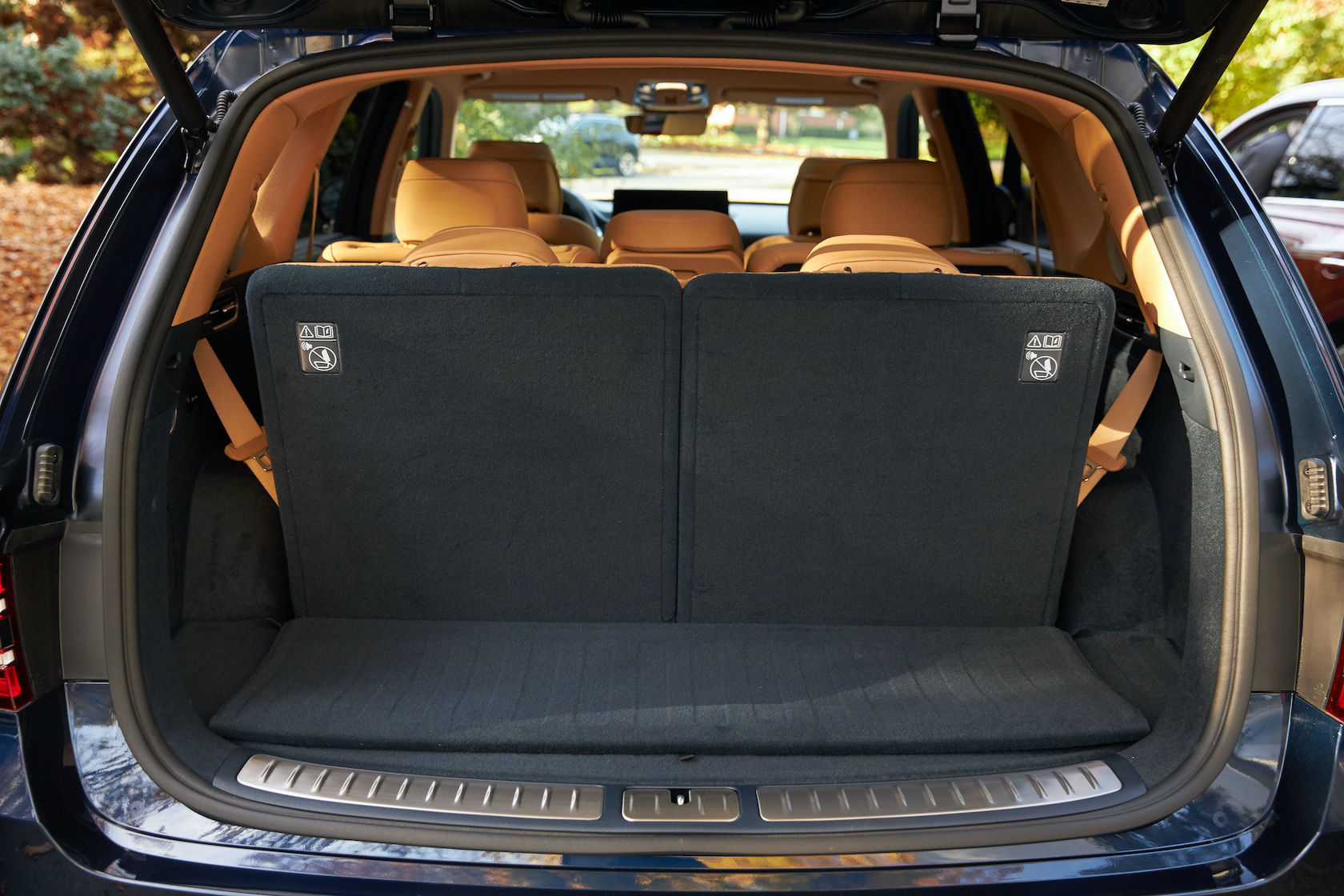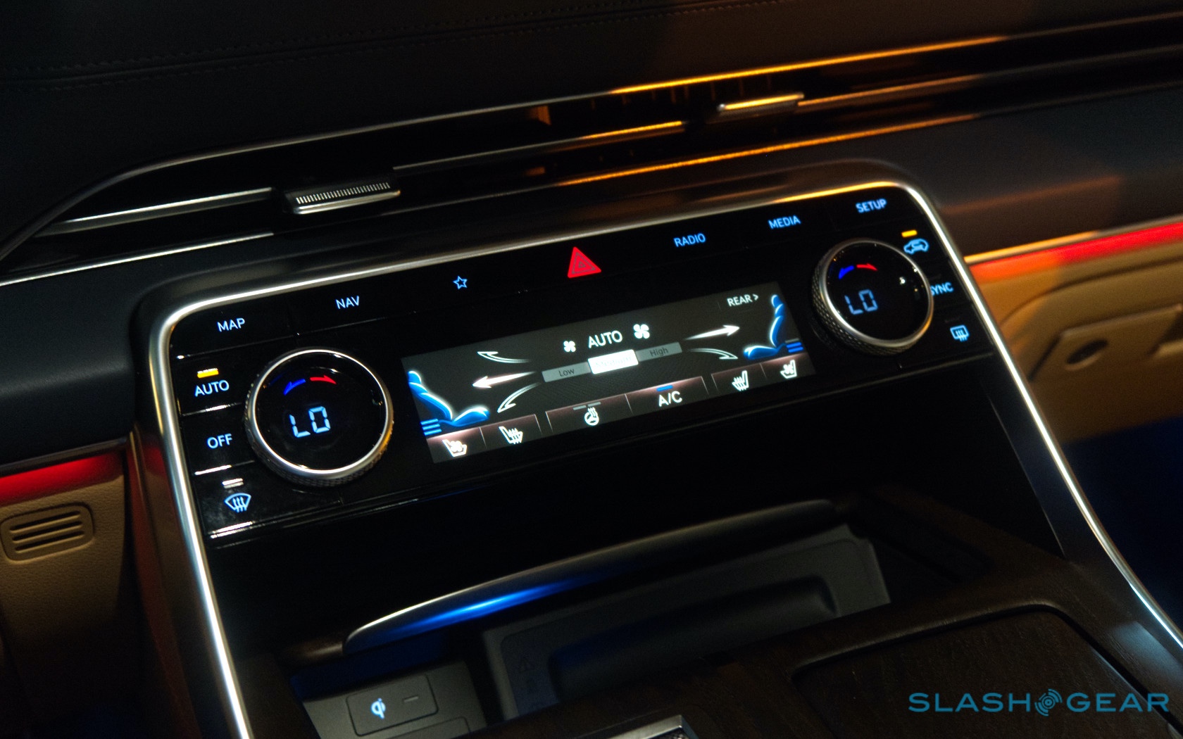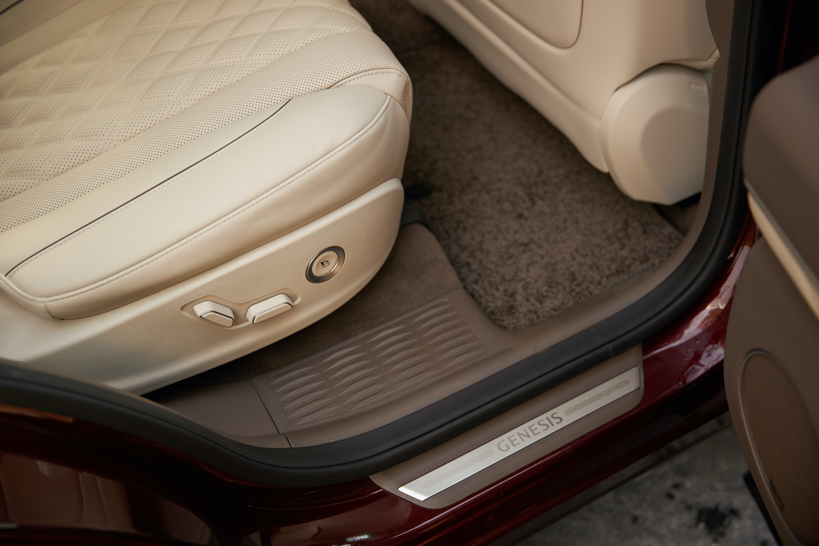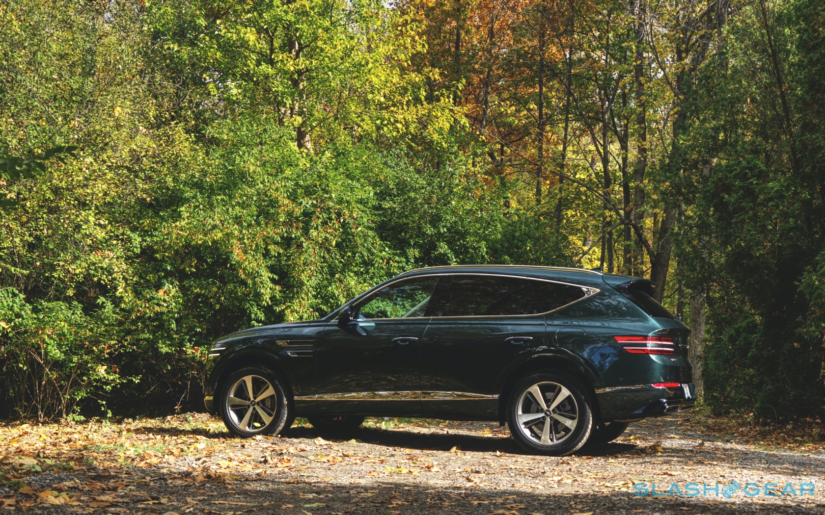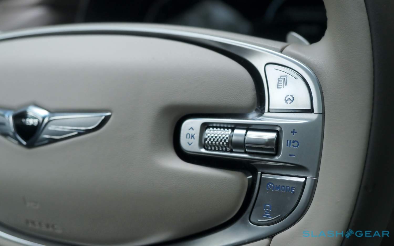 Inside, it's a calmer, cleaner place than some SUV cabins we've seen. Genesis keeps the switchgear to a functional minimum, preferring to put most of the detail on the GV80's trio of screens. That includes digital graphics for the driver, a small screen for HVAC controls, and then a huge 14.5-inch widescreen panel atop the dashboard. That's remotely controlled using a handwriting-recognizing dial in the center console.