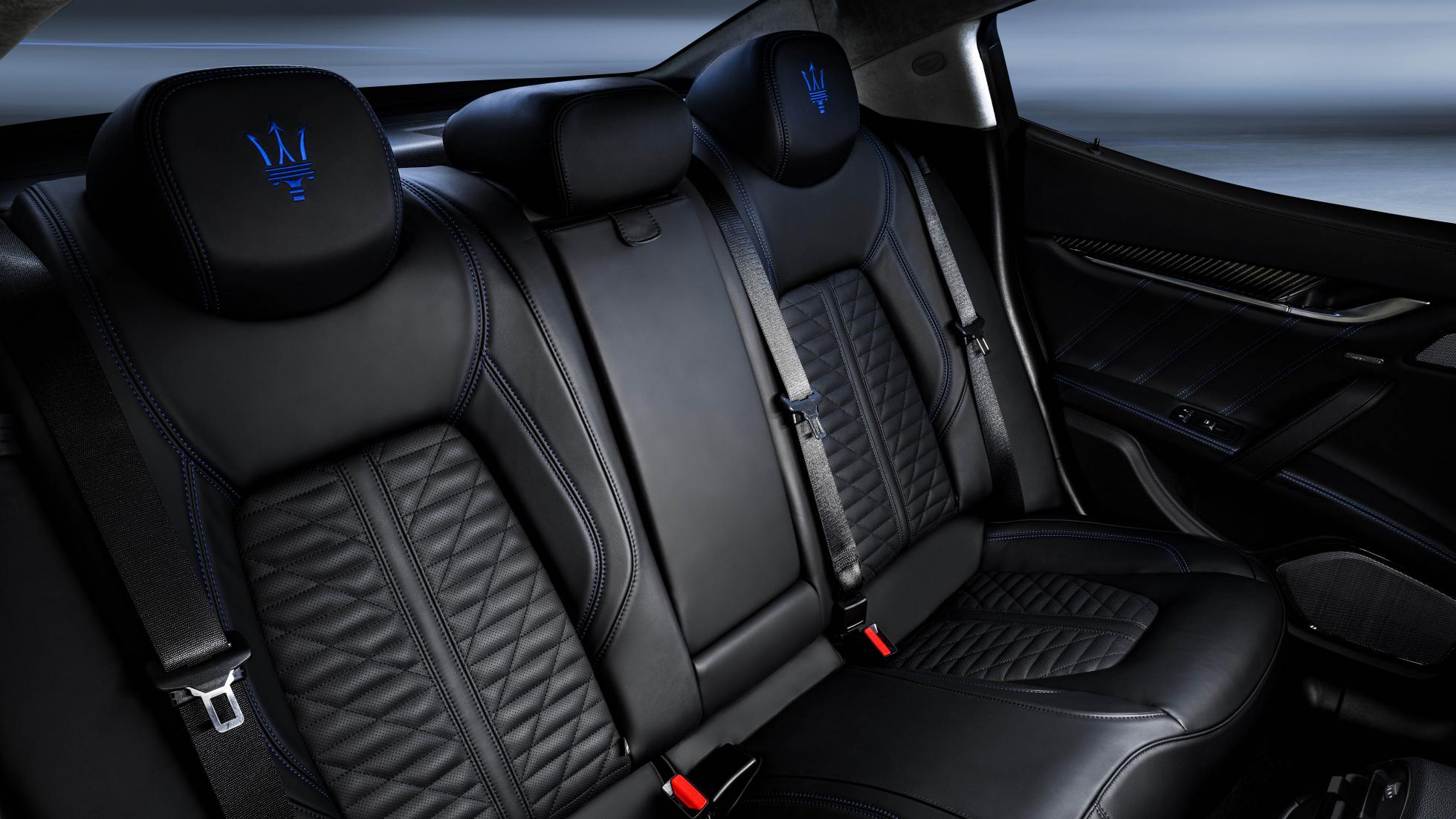 At first glance, the Ghibli Hybrid resembles a standard gasoline-only Ghibli. But to make it stand out, the hybrid is distinguished by light-blue accents on the rear pillars, side air ducts, brake calipers, and in Maserati's trident logo. The Ghibli Hybrid also gets a slimmer front grille and new taillights. Inside, the hybrid theme continues with light-blue embroidery on the seats.