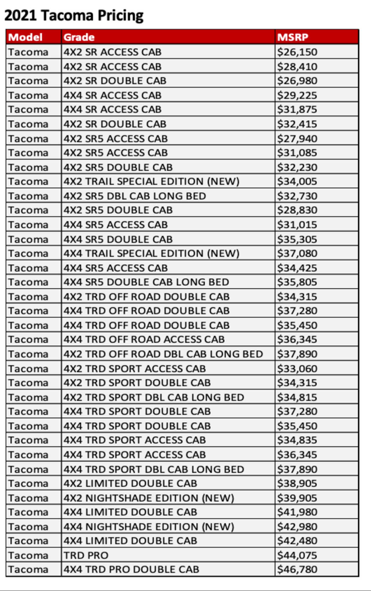 The 2021 Nightshade edition is built on the Limited model with black leather trim and black exterior trim. Pricing for the 2021 Tacoma starts at $26,150 for a 4x2 SR Access Cab. The most expensive version of the truck is the 4x4 TRD Pro Double Cab starting at $46,780. The 4x2 Nightshade addition is $39,905 with the 4x4 version for $42,980. Toyota priced the 4x4 Trail Special Edition at $37,080. The full price list can be seen in the gallery above.
