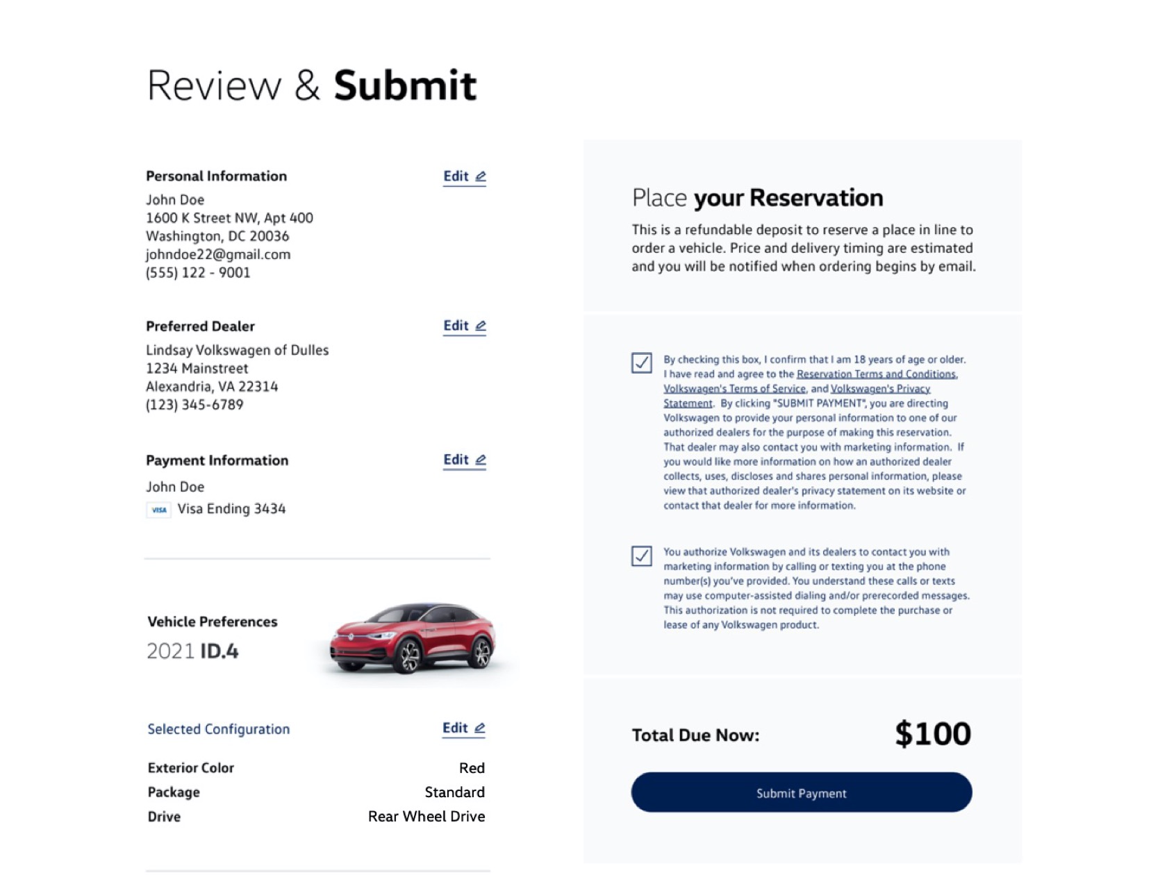 "We're effectively getting a hot lead," VW's Movassaghi explains, with the online reservation process including picking your local dealer of choice. The information put into the site gets passed on to the dealer and, when the order is "locked" later on in the purchase process, both the $100 initial deposit and $400 locking deposit go toward the final price of the car. However they're fully refundable until the paperwork is signed at the handover – and so, too, could the final pricing theoretically change up until that point.