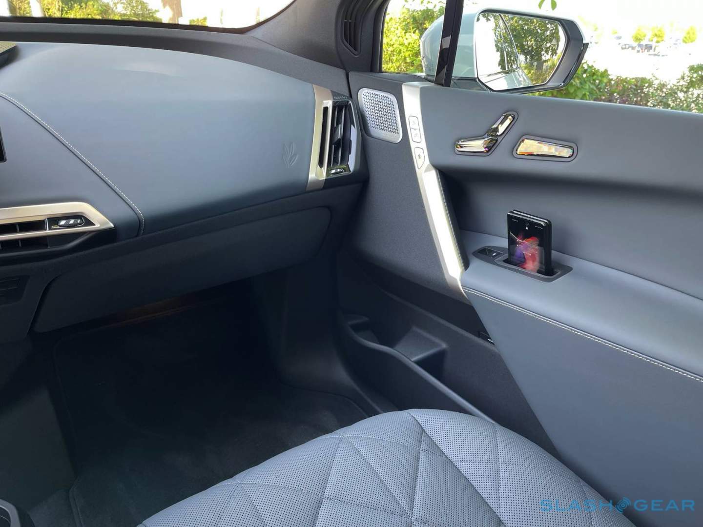 You feel the next-gen tech even before you get within arm's reach. The iX utilizes ultra-wideband triangulation technology to learn the distance between the car and your keyfob or smartphone. That in turn means it knows from which direction you're approaching, and how far you are from the vehicle. Come within 10 feet, and the iX runs through a choreographed lighting sequence, including the exterior lights, the illuminated door handles, and the active light carpet.