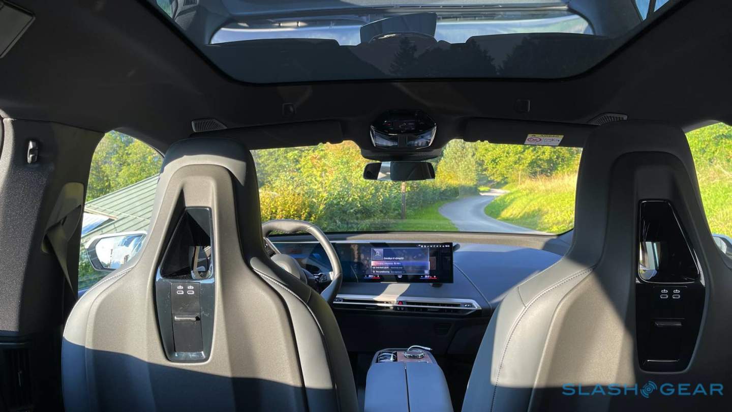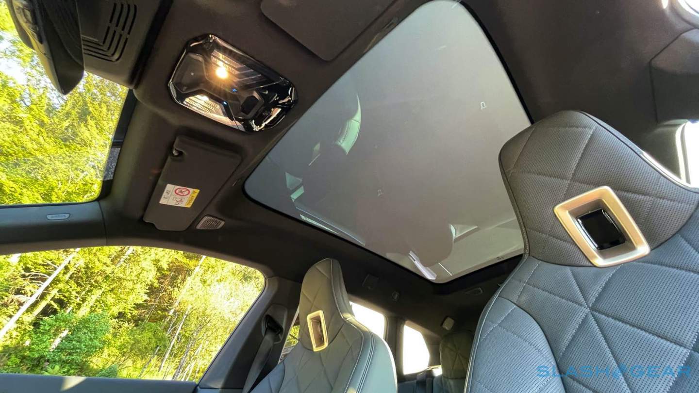 That's the next-gen iDrive 8 infotainment system, here shown on a curved glass panel angled towards the driver. Behind the glass are a 12.3-inch digital instrument panel and a 14.9-inch central touchscreen. The center console is home to a familiar iDrive rotary controller with rocker switches and active haptic buttons. Also standard is four-zone automatic climate control with an integrated nanofiber filter to prevent allergens and microbial particles from intruding into the cabin. I'm a fan of the panoramic glass roof with electrochromic shading, eliminating the need for a roof liner. BMW says the iX xDrive50's glass is the industry's first example of Polymer Dispersed Liquid Crystal Technology being used to shade the interior.