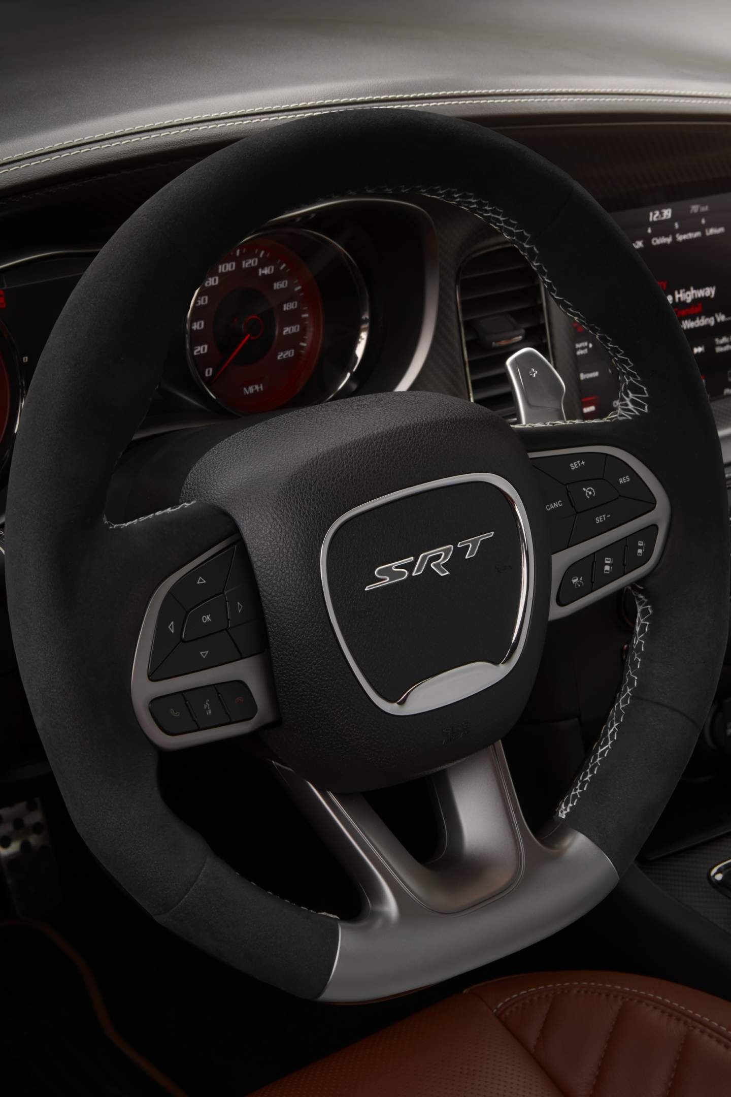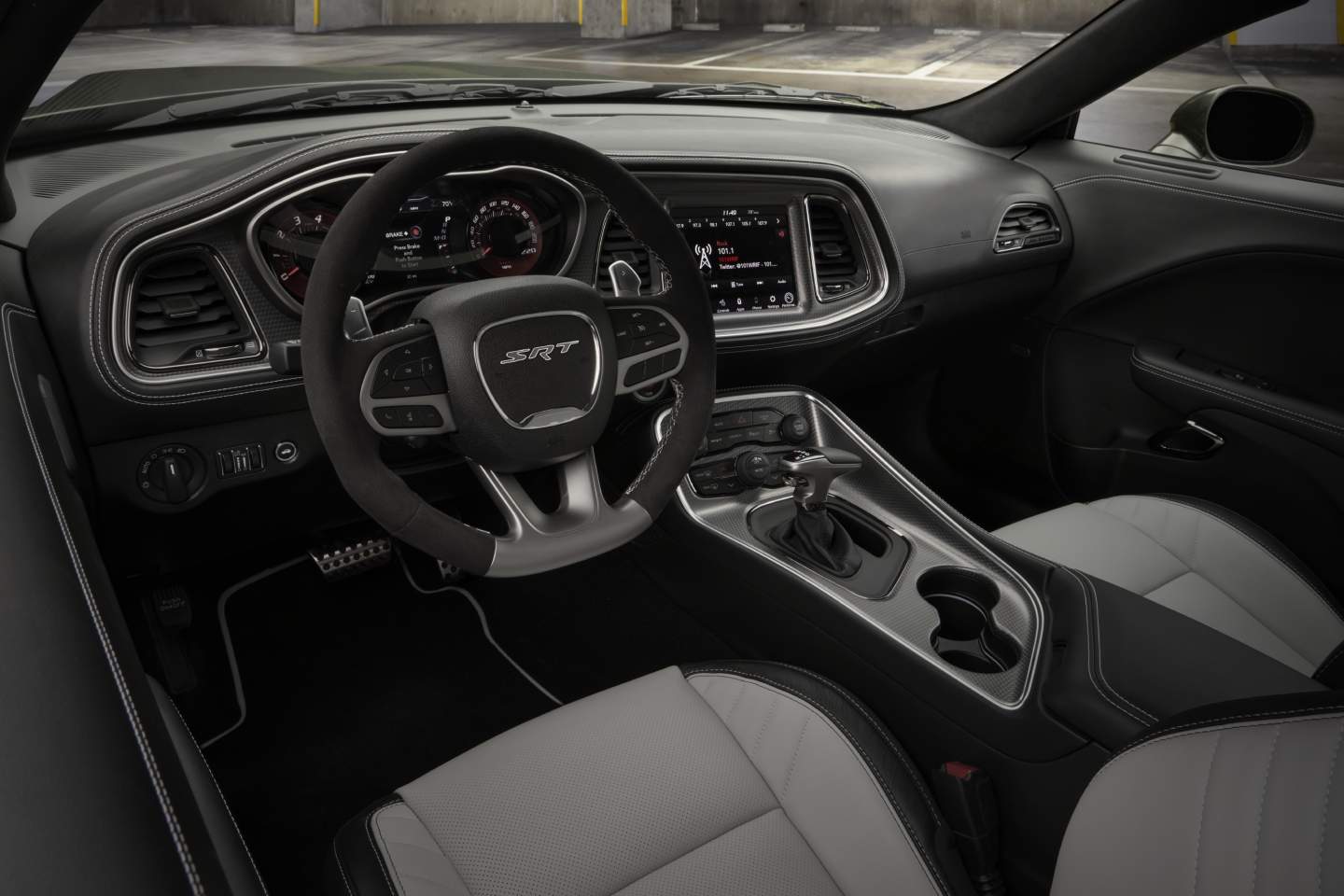 Additionally, the Challenger SRT Hellcat Redeye Widebody Jailbreak has exclusive options like Hammerhead Grey Laguna leather seats and floor mats, a leather and Alcantara steering wheel, blue and yellow brake calipers, a chrome fuel door, Brass Monkey/Satin Chrome/Red exterior badging, and 20-inch by 11-inch satin carbon or low gloss granite wheels.