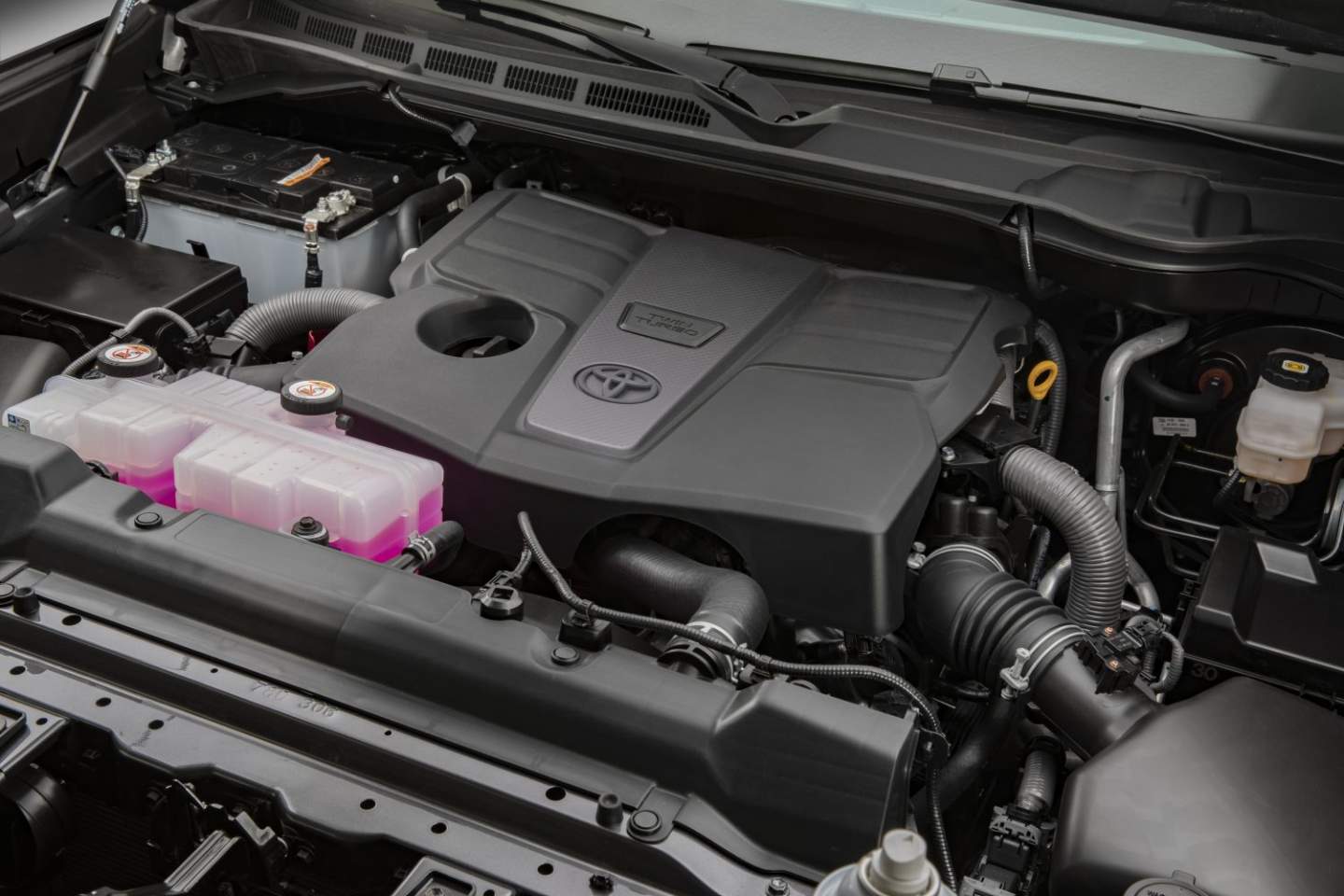 But the grille is not the only thing the new Tundra is getting from the Land Cruiser. Under that bulbous hood is not a V8 engine. Instead, it receives a twin-turbocharged V6 with dual overhead camshafts, a water-cooled intercooler, and dual VVTi. Equipped with an 85,5 mm bore and 100 mm stroke, the V6 churns out 389 horsepower and 479 pound-feet of torque, about 20 less horsepower than the twin-turbo V6 in the Land Cruiser – albeit having the same amount of torque.