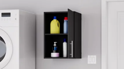 The Elite Wood Freestanding Garage Cabinet is a basic, rectangular unit. But this is a prime example of simplicity done well. The composite material is non-toxic and CARB 2-compliant, and the cabinet has a soft-edge door mounted with six-way adjustable European hinges. These allow the user to adjust how the door hangs after installation, without removing the entire hinge. The door also comes with a satin nickel-finished metal handle. It appears that Home Depot currently only has this unit in a black laminate finish, though it's also available in white on Prepac's website.