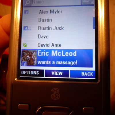 Anybody cautious about Facebook ubiquity should look away now. The INQ1 automatically synchronizes contacts with Facebook, Skype and Flickr, offering up peoples' current status, recent updates and Skype availability when browsing through the address book. The Facebook app caches changes when there's no connection present, with comments, messages and updates added as soon as it finds a signal.