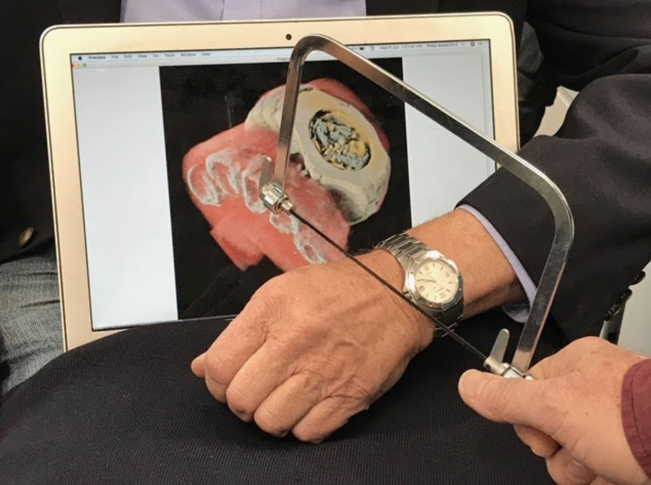 ABOVE IN GALLERY: "Prof Phil Butler displays the area of his wrist that was scanned as one of the first human images taken using the MARS large bore spectral scanner." Scans as well, all from MARS Bioimaging Ltd.