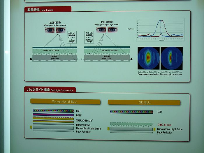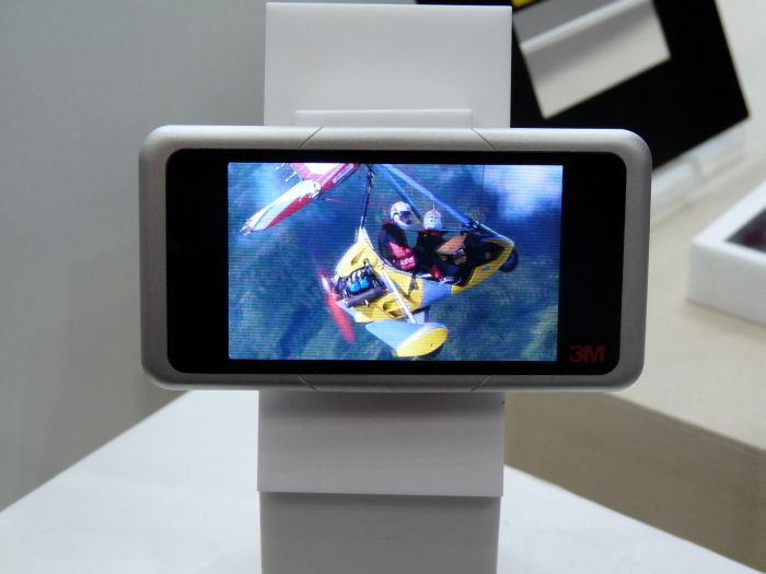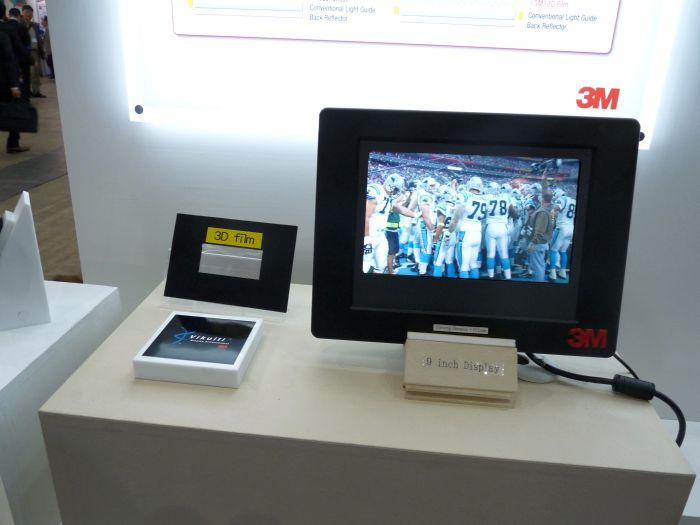 Even better, when both backlighting elements are lit, straightforward 2D content can be shown with no optical interference. 3M have been demonstrating a compact 2.8-inch panel – ideal, dare we say it, for PMPs and cellphones – as well as a larger 9-inch display that uses the same system; the company claims to have begun mass production for small and medium sized displays.