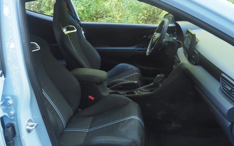 As for that practicality, the cabin is a reasonable but dour place to sit. Splashes of color on the N-unique buttons and switches are nice to see, but everything else is dark, dark, dark. Black sport bucket seats, black dashboard, black buttons and switchgear. The illuminated "N" logos on the seats help – well, up until the point where you sit on them, and then your neck blocks the view – and the seatbelts are a contrast shade, but generally this is a cave-like experience.