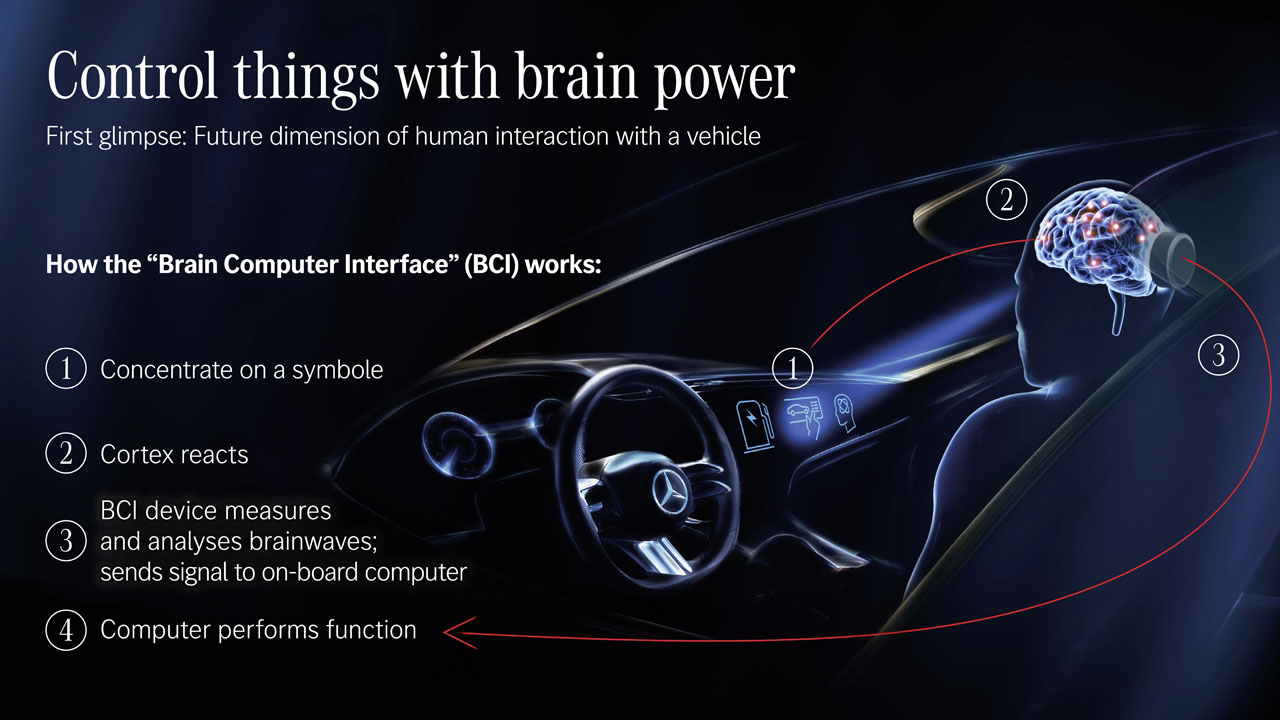 The Mercedes technology requires a one-minute calibration process where the brain reacts to visual stimuli on the dashboard. The visual stimuli is in the form of light dots projected onto the fully digital dash of the vehicle.