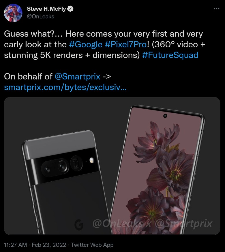 A few hours later, it was the turn of Steve H. McFly – better known by his handle OnLeaks – who collaborated with Indian tech blog Smartprix to release the first renders allegedly showing the Google Pixel 7 Pro.