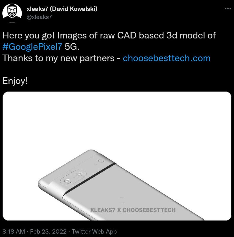 On February 23, two different sets of images leaked that supposedly show what the next generation Pixel devices may look like. The first set of photos came from a little-known portal called "choosebesttech," which, in collaboration with tipster xLeaks7, released CAD renders of a device that they claim to be the Google Pixel 7.
