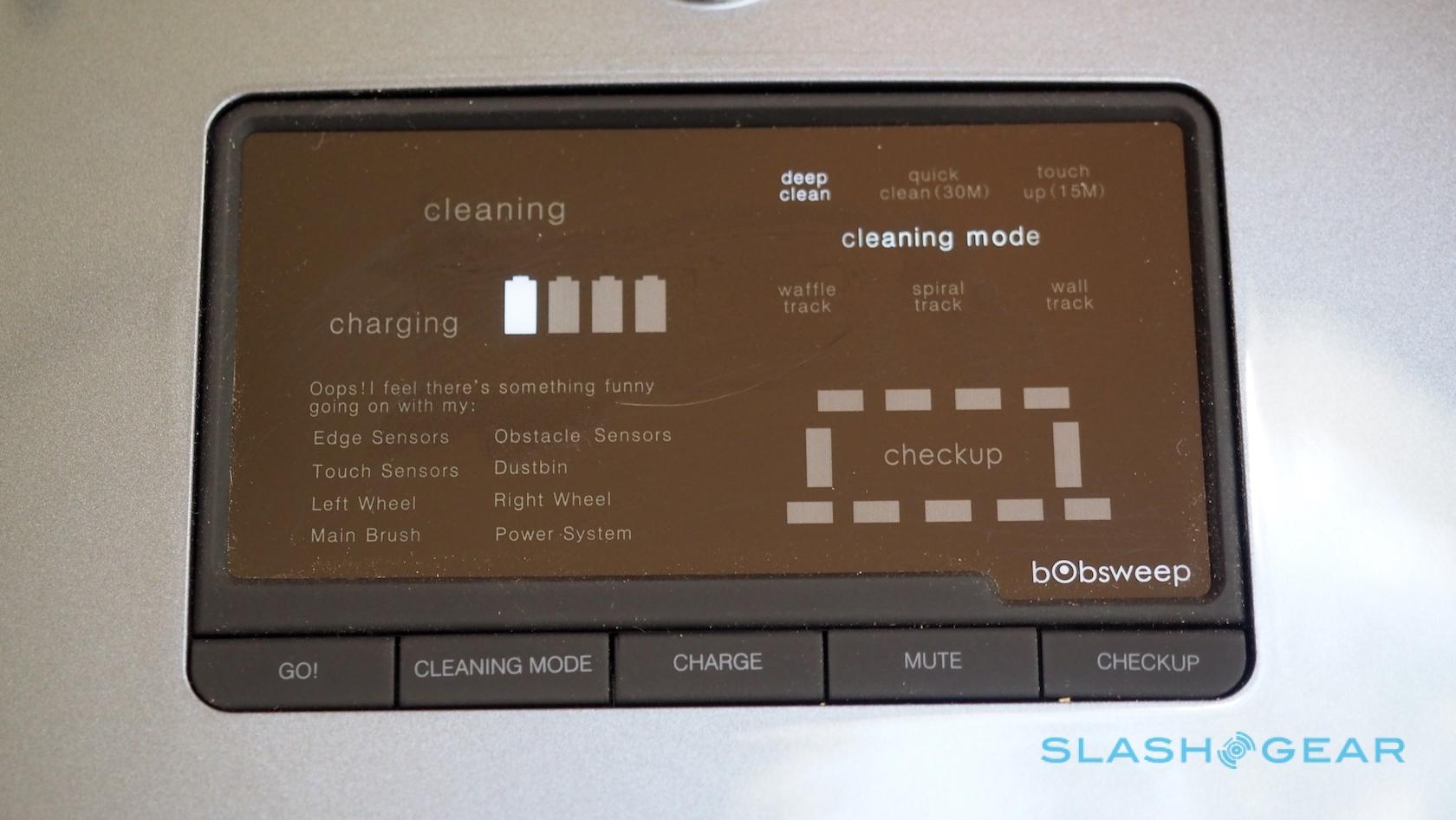 A grey and black plastic charging station sits against your skirting board and plugs into the mains, and then bObsweep sits atop its contacts to charge up. At first glance it looks like there's a sizable LCD on top of the robot, but it's actually a series of backlit legends for things like battery level, cleaning mode, and error messages. There are also shortcuts to start cleaning or end the current program.