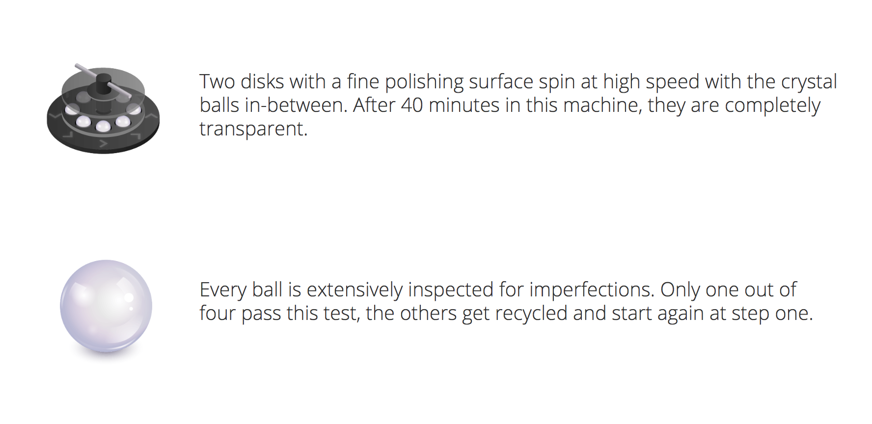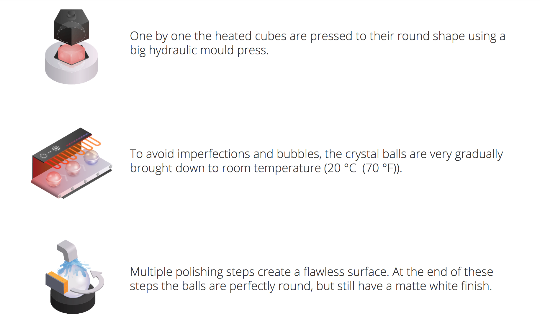 Each one of these balls is guaranteed scratch-free hardened K9 crystal. There's a big impressive process each ball is said to go through before being boxed up – have a peek at that here in a few shots in this gallery: