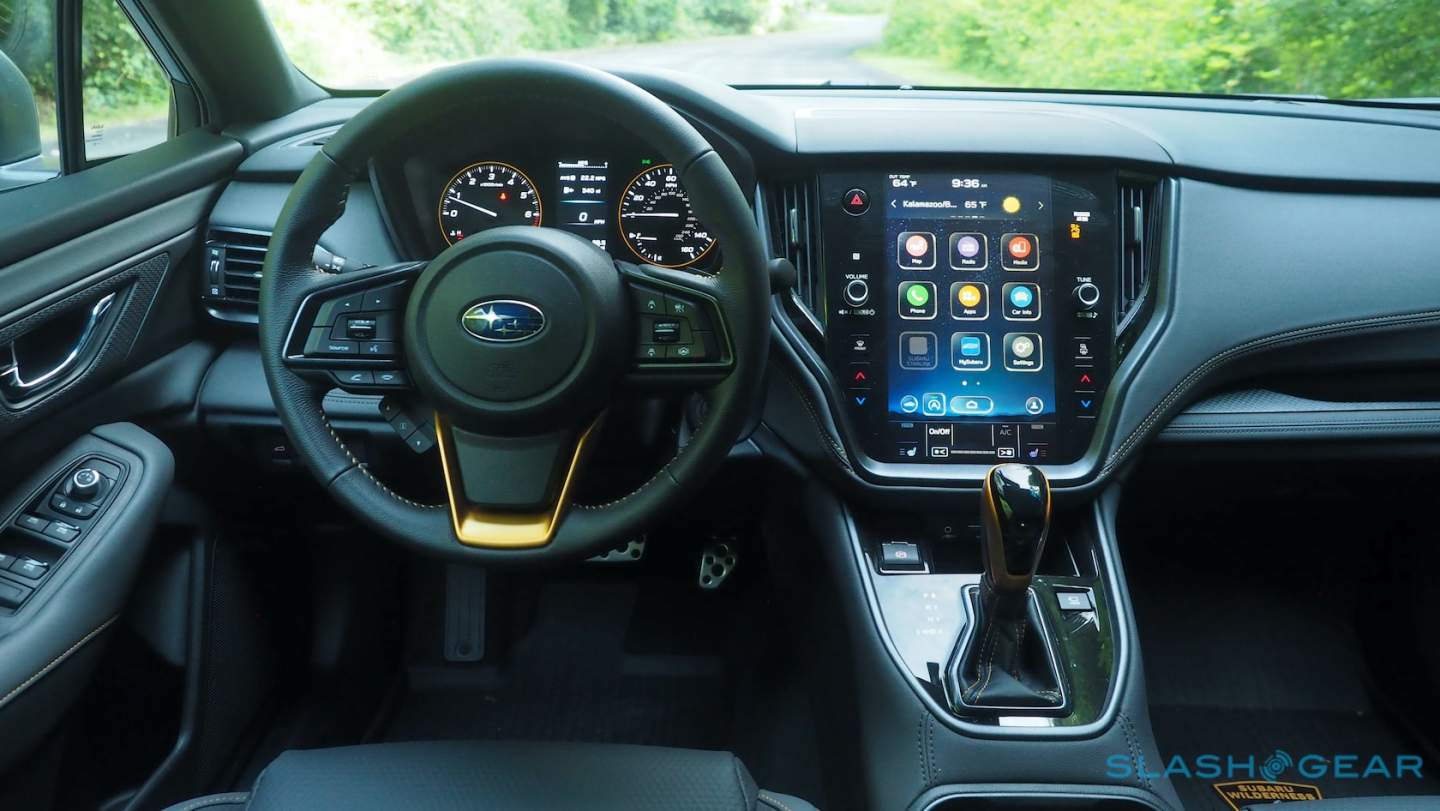 Inside, the Wilderness changes include StarTex water-repellent seats, special embossed rubber floor liners, more copper accents, and some matching tags stitched in. An 11.6-inch portrait-aspect touchscreen with Subaru's Starlink infotainment is standard, with Apple CarPlay and Android Auto, dual front and rear USB ports, and EyeSight Driver Assist. The latter includes automatic emergency braking, adaptive cruise control with lane centering, lane departure and sway warnings, and blind spot warnings with rear cross-traffic alerts.