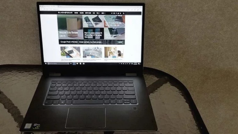 In true YOGA fashion, the display has 360-degree hinges that enable users to tilt the screen fully backward so that the lid sits flush with the bottom of the laptop. The hinges are capable of holding the screen at any angle between 'laptop' and 'tablet' modes, the latter of which pairs nicely with Windows 10's automatic tablet-mode switching feature. It is, obviously, much thicker than an actual tablet, but slim enough to be reasonable for tablet-like usage.