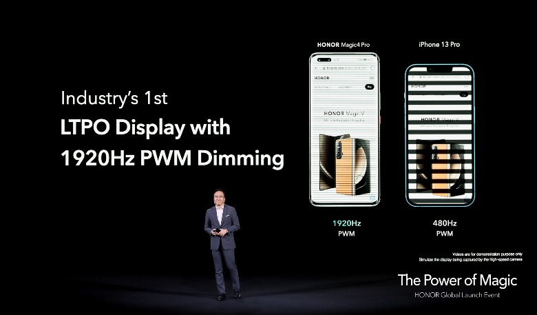 As the name suggests, top of the tree is the Magic 4 Pro. Its 1312 x 2848 display supports up to 120Hz adaptive refresh (that can go as low as 1Hz), HDR10+, 100% of the DCI-P3 color space, and 1,000 nits of maximum brightness, plus it can automatically upscale SDR content to HDR and HDR10 to HDR10+. It's covered with an 86-degree quad-curved glass, and supports high-frequency PWM dimming – at 1,920Hz, versus 480Hz on an iPhone 13 Pro, Honor points out – to cut eye strain.