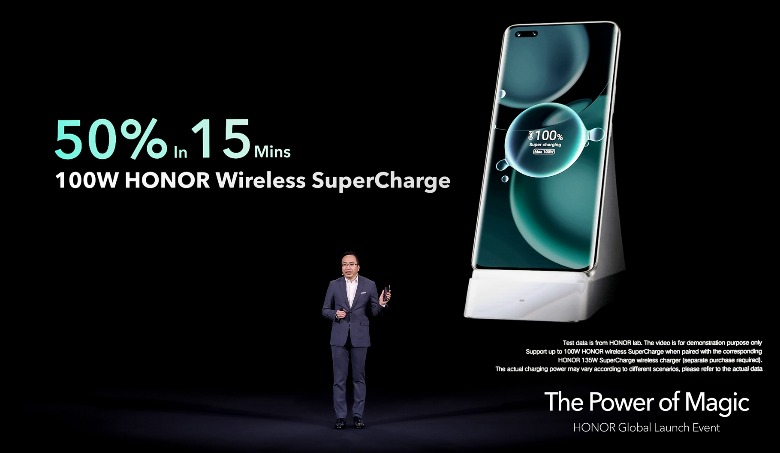 There's a 4,600 mAh battery with support for a hefty 100W wired and 100W wireless charging rates. With Honor's 100W wireless charger – which packs a 135W power adapter that could make some laptop PSUs jealous – you're looking at up to 50% charge in 15 minutes, or a full charge in 35 minutes. There's also reverse wireless charging.