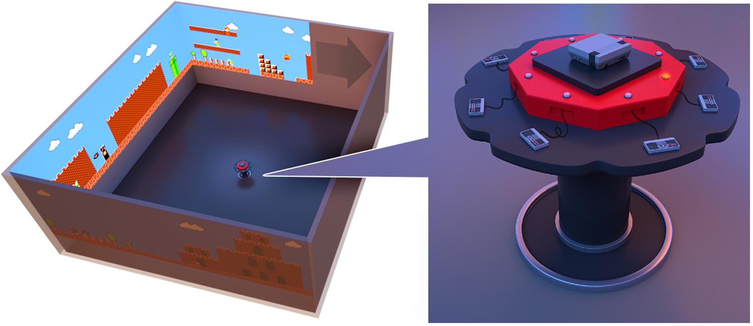 With eight controllers connected to the console, the gameplay is projected onto four walls as a panorama. Players are continually moving to the right, as is always the case in the 8-bit Super Mario Bros., with the world they pass through left behind on the screens until a 360-degree rotation has been made. Only one person is in control at a time, and the 360-degree display is broken into eight sections, so gameplay is passed from one person to the next.