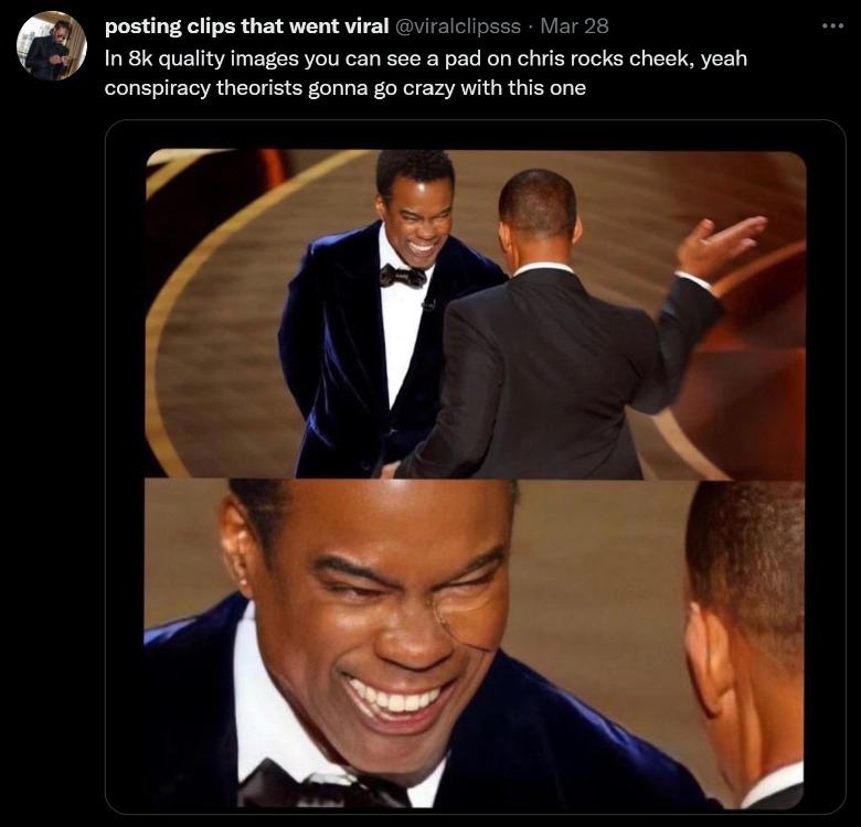 Though the claim is easily dismissed based on those professional photographs, one must wonder why the Twitter image seemingly shows a pad on Rock's cheek. Though it's impossible to say for sure, the tweet suggests someone upscaled a low-resolution screenshot of the incident to a higher "8K" resolution. This process is fairly simple thanks to apps like AI Enlarger and desktop software like Topaz Labs' Gigapixel AI (though there's no reason to assume either of those products were used to create this particular image).