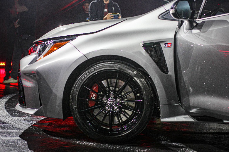 All of this is built atop a wide, rigid platform based off of the GA-C architecture used by the standard Corolla and CH-R, among other Toyota vehicles. A MacPherson-type strut is found up front while the rear uses a multi-link double-wishbone suspension setup. The GR Corolla rides on 18-inch gloss black 15-spoke alloy wheels, shoed with Michelin Pilot Sport 4 tires. These wheels house a brake system composed of fixed-caliper disc brakes with 14 x 1.1-inch ventilated and slotted rotors outfitted with 4-piston aluminum calipers up front. In the rear, you'll find 11.7-in. x 0.7-in. ventilated rotors with 2-piston aluminum fixed-caliper disc brakes.