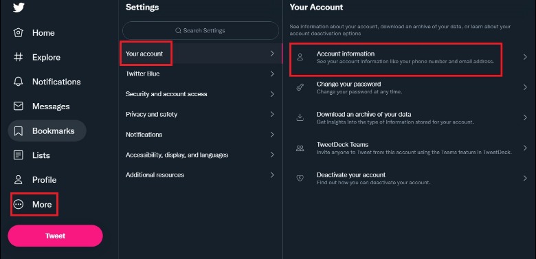 Navigate to Twitter settings. On the mobile app, this can be accessed by tapping your profile picture in the top-left corner and scrolling down to Settings. On the desktop, you'll find Settings tucked away under "More" on the left-hand side of the screen.