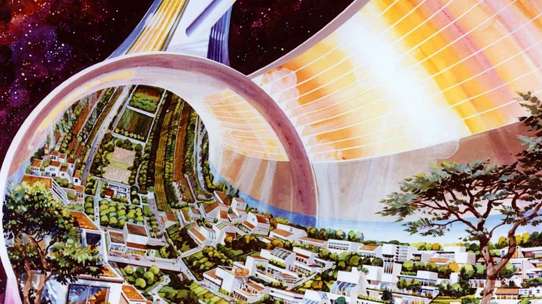 The Stanford Torus concept was a design for a habitat that could house 10,000 residents in space, according to the companion paper "Space Settlements: A Design Study." The concept imagined a massive wheel-like structure a mile wide in a fixed, stable position between the Earth and the moon that would slowly spin at one revolution per minute to generate artificial gravity. People inside the city would be able to grow crops and maximize solar energy while mirrors would reflect deadly radiation. The materials to build the city would be sourced from the moon, and industries in the city would flourish with solar power — or, at least, that's what the concept envisioned.
