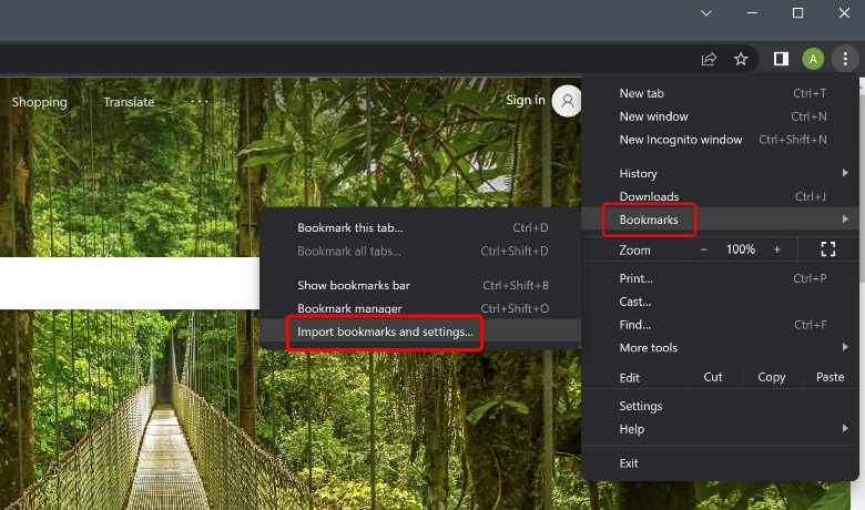 4. Open Chrome and go to Bookmarks > Import Bookmarks and Settings