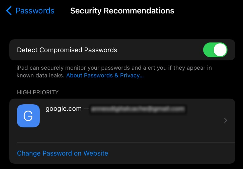 - Tap on an account to see more details about its security status. If any of your accounts are using a password that's weak, easy to guess, or has been compromised in a data leak, it will be displayed here.
