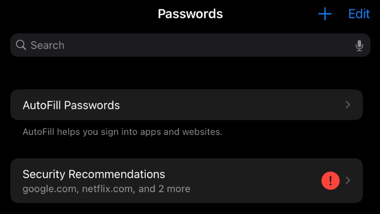 5. Once you're in, you'll see a list of all your stored passwords. If you see a yellow warning icon next to any of the passwords, that means Safari has a security recommendation for it.