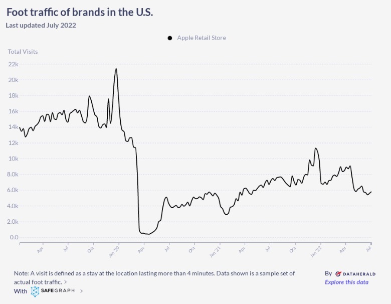 Through 2021, customers began to come back and footfall numbers increased steadily. Despite the increased traffic, numbers only broke through the 10,000 visitors per week barrier once — and that was in December. The winter boost may have been down to Christmas shoppers picking up Apple products in person. Or, given that a good number of Apple stores are located in malls, it could equally be down to bored Christmas shoppers popping in for a browse. January saw another dip in footfall, and the most recent count in July of 2022 saw numbers dip below 6,000 again.