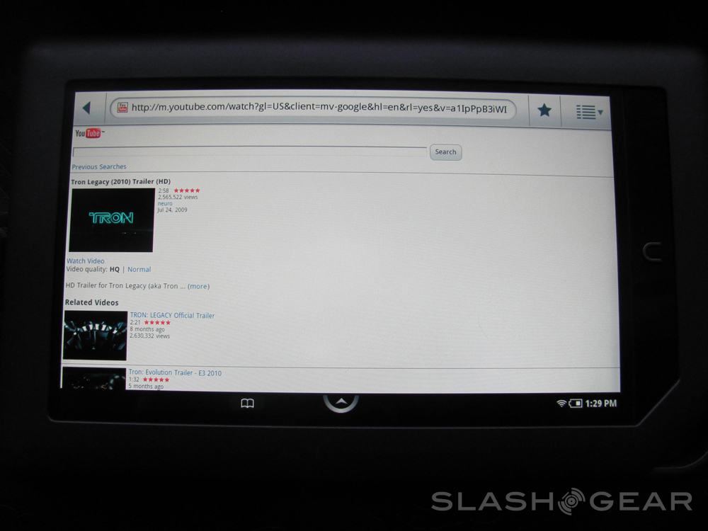 YouTube works but plays relatively low-quality video for what you know this device is capable of (you see a magical array of video when you first turn your device on), NetFlix does not function. Above you'll see an example of how well the browser handles the first TRON Legacy sneak preview trailer – notice a couple things – the reflection you see of the camera I'm holing up to film the screen (this device has a somewhat lowered glare, but you can still definitely see yourself in it when the screen is black), and the sound- it's a bit muffled as the speaker is on the back of the device.