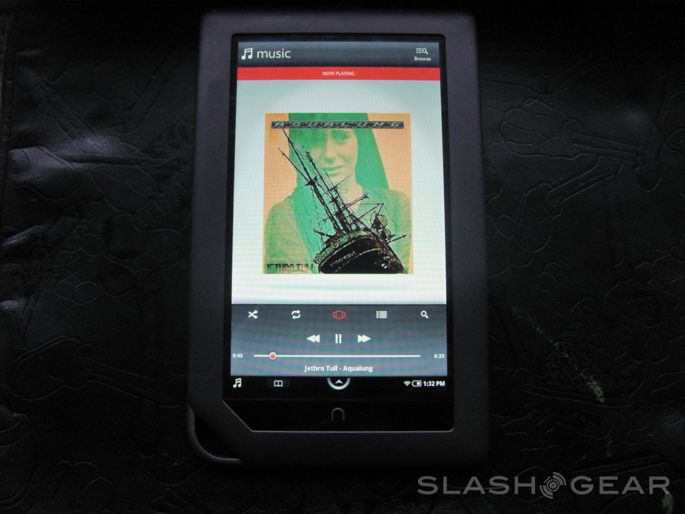 There's a super simple Music app where you can play music files you've added through your "My Files" – THIS is the simplest and best implementation of the My Files feature, just drop your music files (more than likely MP3s) into your Music folder upon finding it once you've plugged your NOOKcolor into your computer, and poof! They're in your Music app. Simple. This app is in place so that you might plug in your headphones and listen to music while reading. Of course, you could also use this function as a giant music player if you're the sort of person who plays music in your car through a headphone jack, but seeing as how MP3 players are basically given away these days, this might be a bit unreasonable.