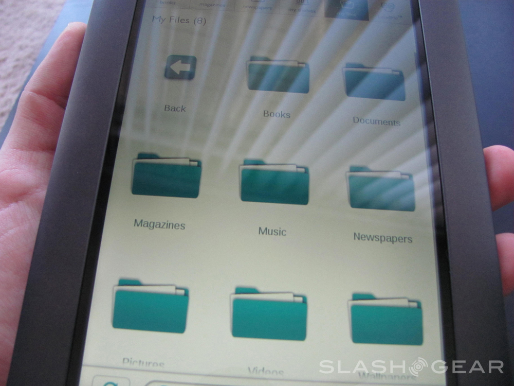 First let's chat about this files section. It seems to be rather secondary in that you're going to have to know exactly what you're doing as far as file format goes if you plan on using any files you didn't download from B&N directly. After an hour of trying for a video file format that worked on the device (even after having check the manual hosted on NOOKcolor,) I was unable to get a file running. I'm no magician, but if I'm unable to find a file format that works, you bet your biffy Grandma Edna won't be able to do it either.