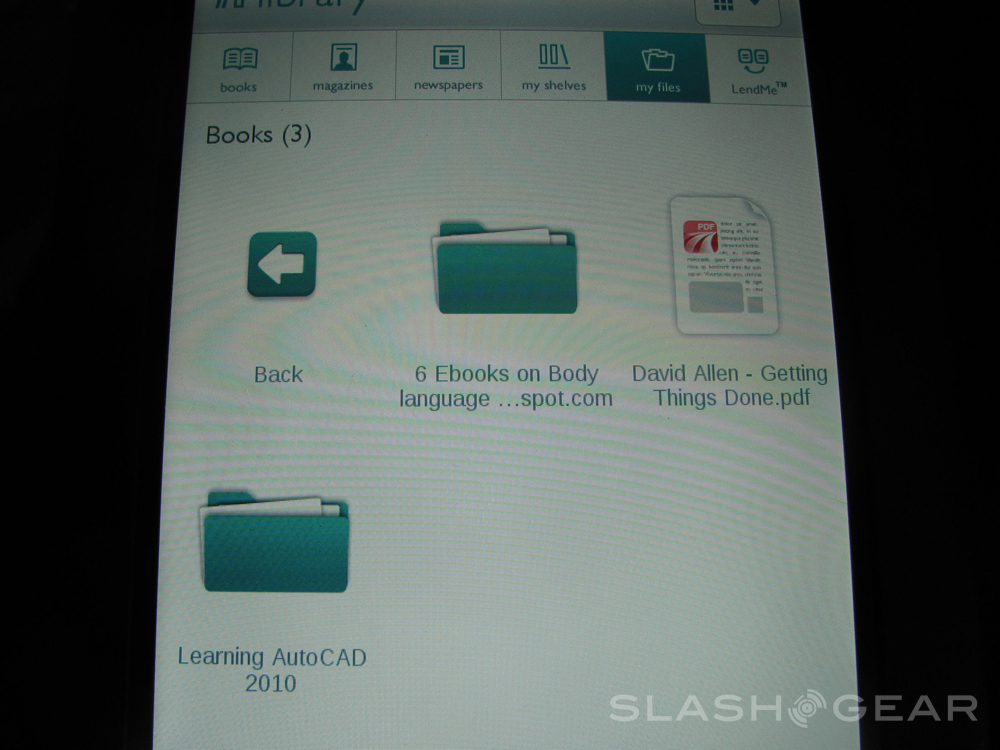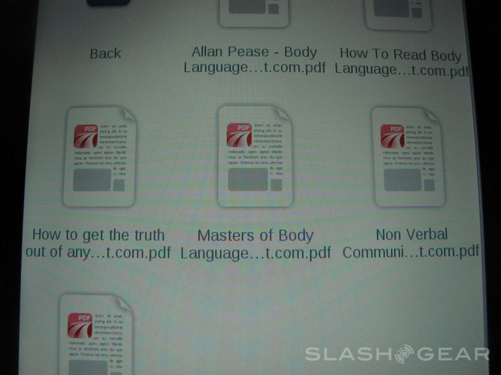 Each PDF book I've downloaded here has opened without hassle. If you remember the battle it is to get a video file working, you'll know that this is an excellent sign – just as easy as it was to get photos and music files loaded, come to think of it. Each PDF not only loads seemingly as quick as the last, but flicking through pages (up and down, not left and right as you would in a B&N book), is quick and nice too. Each PDF file is instantly added to your library in the Books section, but does not appear to show up on your desktop with your recently read or updated items. Inside each book, full color works, and there's that BACK BUTTON!