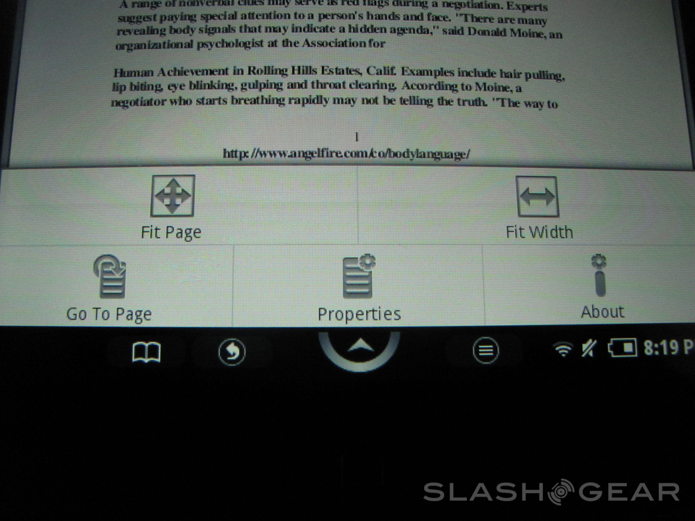 I KNEW it had to be somewhere here in the system, that ever-helpful back button that should, by all means, be present in the rest of the OS. But I'll settle for knowing it exists here for now. It is a bit confusing to see it exist only here though, as it doesn't just pull you back out of a PDF, it brings you back from the PDF menu too – this tells me the back button might be working everywhere by the time they send out an update for this device.